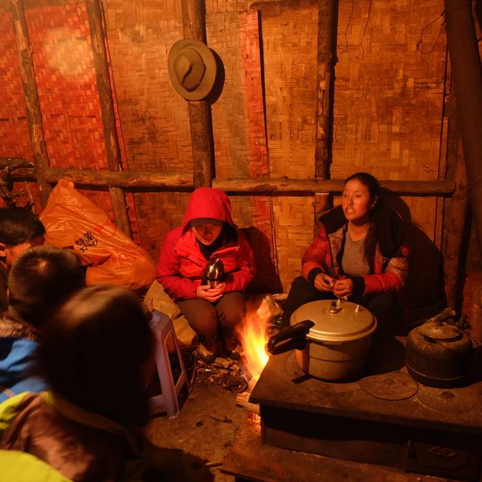 草棚子设备很简陋,就一个木屋,被隔成几段,左边是厨房,右边几个是休息的地方,没有床,只能铺上防潮垫睡睡袋。