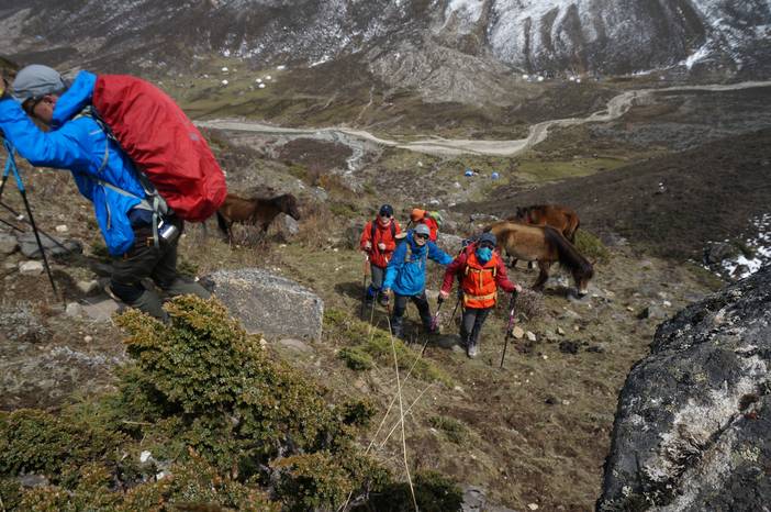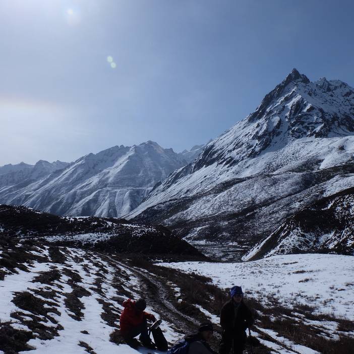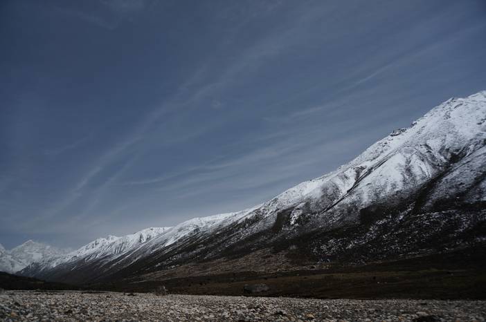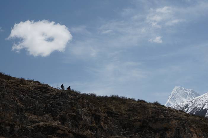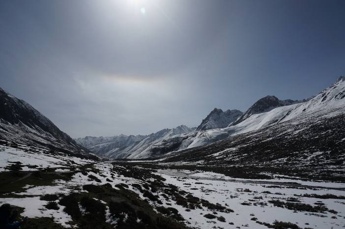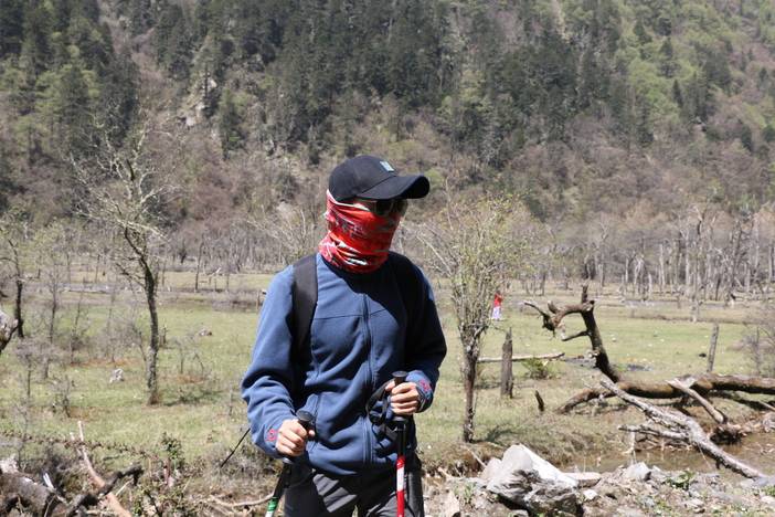 原本行程是顺河流往上,翻越日乌且垭口到莫溪沟去,无奈天有不测风云,日乌且因雪太大而无法逾越,因此只能改走盘盘山。盘盘山路段几乎很少走,除了当地藏民,因此路也十分不好走,无奈也就只能去寻找以前的老路。