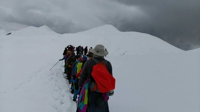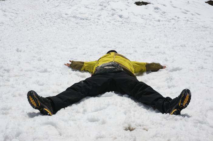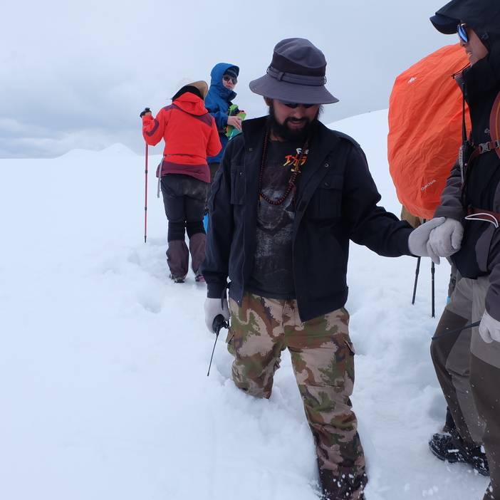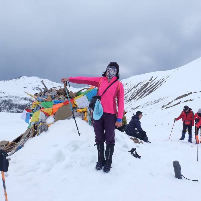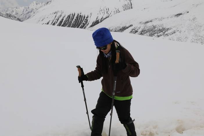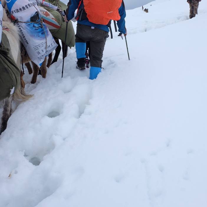 越往里走雪越大,快到垭口的时候雪已经漫过了膝盖。这时候向导找到了我说雪太大了,马过不了。雪太大,马匹过不了,马过不了就表示装备运不过去,没有装备就意味着我们也得返回,也就表示行程到此就快结束了。