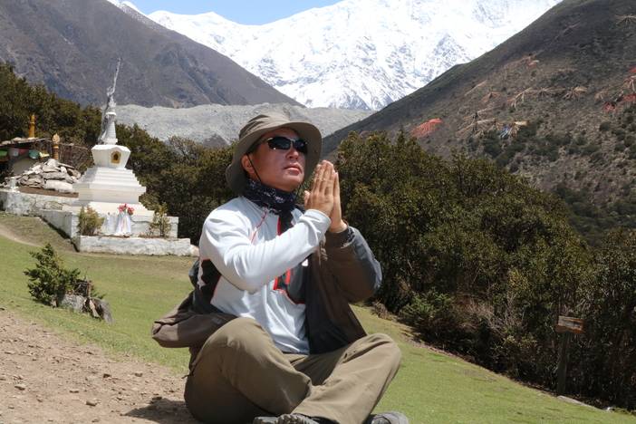 贡嘎寺前大叔的摆拍,后面的贡嘎山主峰若影若现。