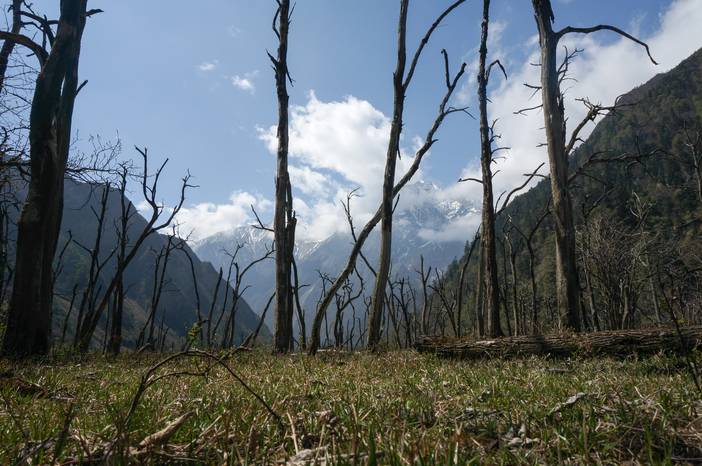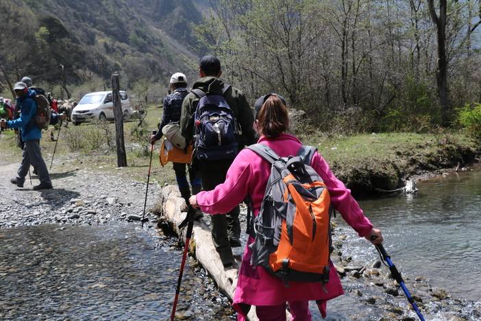第二天在早餐完毕后便出发,顺着河流一直往上,映入眼帘的除了原始的密林就是洁白的雪山。