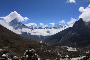 在休息或进行几次短途徒步旅行后,我们将继续前往罗布切,沿着宽阔的山谷攀登,左侧是巍峨耸立的Cholatse 峰和Tawache峰。再转一个弯,就到了昆布冰川Khumbu Glacier脚下的陡坡,这是世界上海拔最高的冰川。 冰川上布满了雪崩留下的碎石涟漪,融化的积雪在冰面上刻画出令人惊叹的图案。到坡顶之后,会发现小路的顶端有许多石墩,这些是为了纪念在带领珠峰探险队时牺牲的夏尔巴人而修建的。沿冰川斜坡继续缓缓前行,最终到达Lobuche。