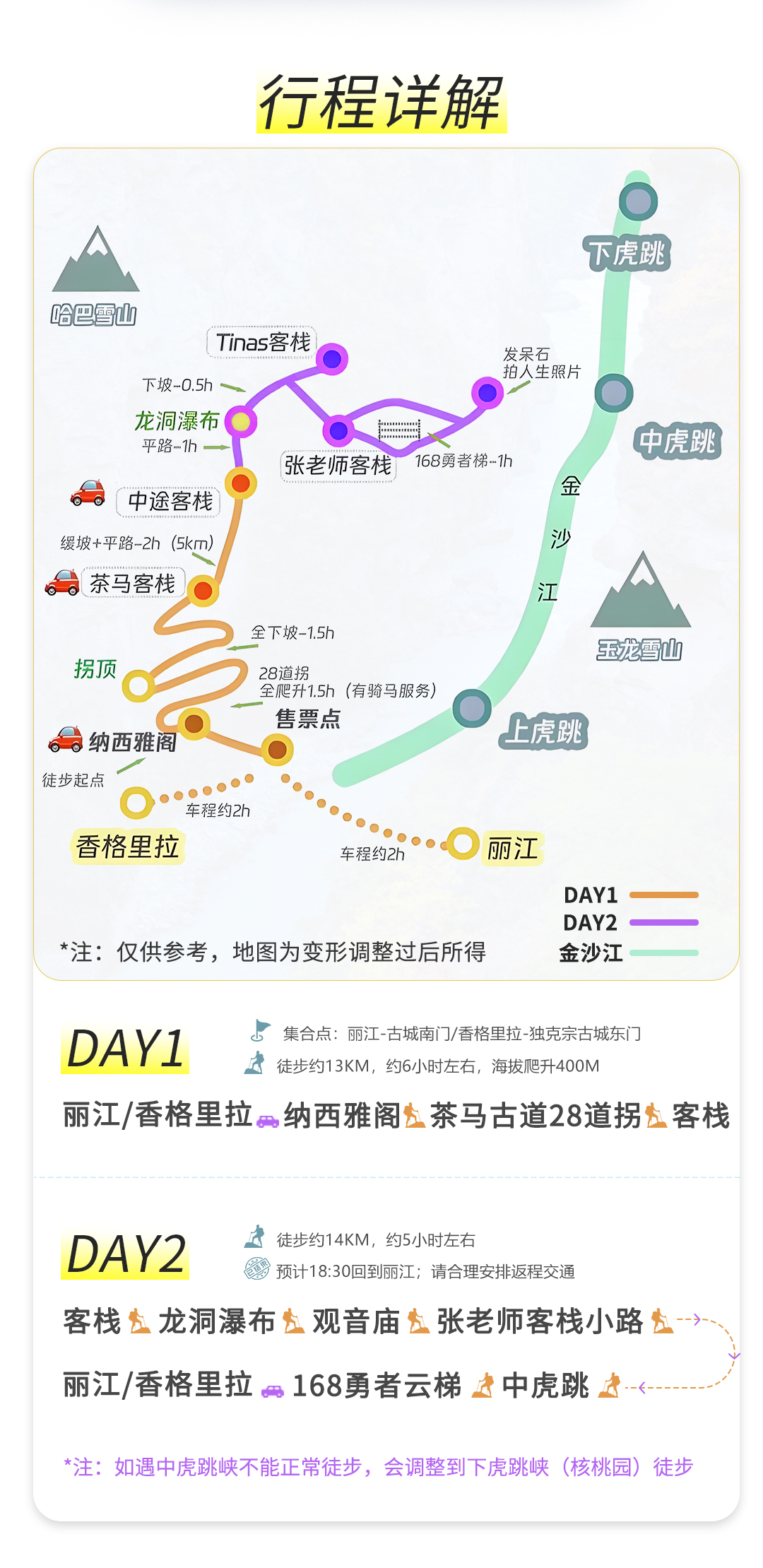注: 如果遇到中虎跳峡不能正常徒步,会调整到下虎跳峡(核桃园)徒步