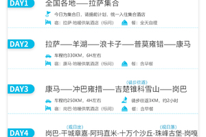 4、羊卓雍措、普莫雍错、冲巴雍措、多庆措、宗措、佩枯措等都在本次行程中,沉浸于不同层次的“湖蓝秘境”,体验“一措再措”的浪漫。