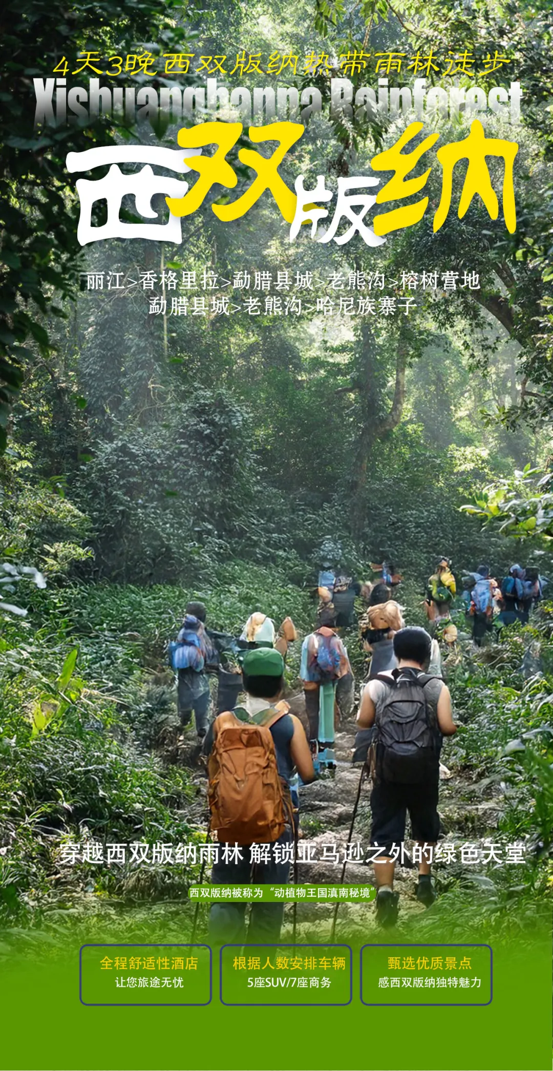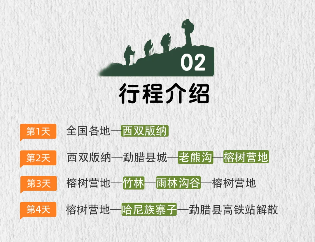 今天将是我们3天雨林徒步的最后一天。早上起来吃完早餐后,收拾和人行李,协助领队撤营。撤营后我们将跟随领队进行今天的徒步活动,从大榕树营地出发,往上爬坡,到达夫妻榕树在此稍微休息,拍照打卡,接下来接着爬升至小垭口,我们将从下口下降进入麂子箐徒步,一路徒步至废弃石场,石场下面有几户零星人家,穿过这几户人家后再次穿进雨林,跟随领队的脚步一路徒步至哈尼族寨子,到达哈尼族寨子后我们将乘车前往勐腊县城解散,建议大家购买下午17:30以后的车票返回西双版纳。餐食:营地早、晚餐;路餐(自带)