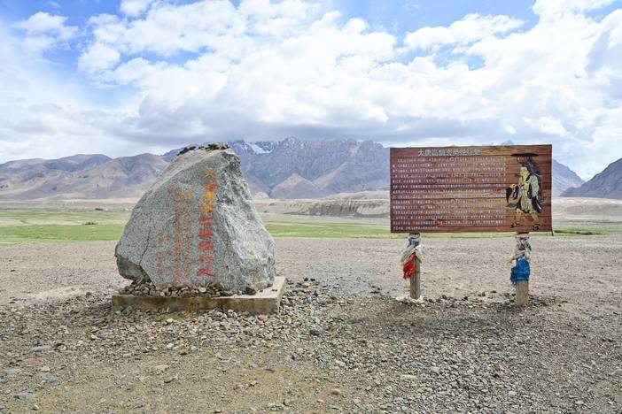第一站抵达瓦罕走廊,西游记唐僧师徒四人的故事伴着我们这一代人长大。故事中的唐僧的就是公元645年著名的高僧玄奘,曾经途径瓦罕走廊,并因此而越过帕米尔高原,通过明铁盖达坂进入今日中国国境。在瓦罕走廊这里后人立碑。沿着塔什库尔干河谷,自吉日尕勒古驿站起,历史上有三条跨越帕米尔的古道。古代塔什库尔干河上并没有桥梁,用骆驼、马匹在浅滩区涉水过河。现在的中巴公路两处有桥可以过河至西岸的卡拉其古河谷,即“瓦罕走廊”入口。