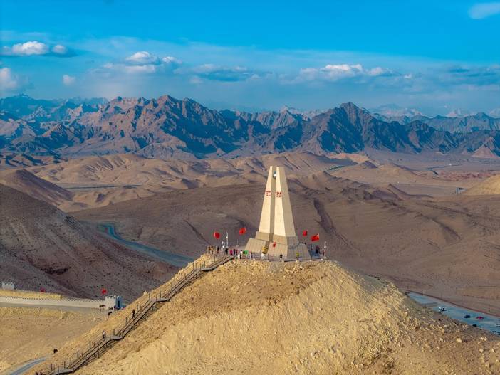 今日早餐后前往本次最后一站,【中国西极】。这里是中国领土最西的地方,这里有个77号界碑,是国人能够到达的最靠中国西极的界碑。从喀什出发翻越海拔2971米的阿克托达坂后,过加斯木桥即是天山和昆仑山的交界处。在缓冲带停好车,眼前即是喀什噶尔河的支流克孜勒苏河,左边黑色的是昆仑山,右边红色的是天山。继续前往在乌鲁克恰提乡附近可以观赏开阔的河谷和牧场,以及遍布周边类似丹霞彩丘的红层地貌,如果碰到下雨天,河水也会变成红色。当车来到一座写着“西极疆门”红色的牌坊下,停好车就可以沿着木栈道拾级而上到海拔3100米标识着经纬度的中国西极石碑处。