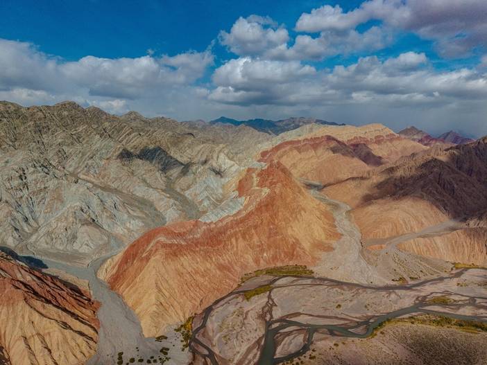驱车抵达奥依塔克红山野狼谷。奥依塔克风景区位于奥依塔克镇西部丛山之中,从奥依塔克山口沿河谷逆流而上,便可到达白云深处被称作“人间仙境”的奥依塔克风景区。这里是一处未被开发的美丽地域,被誉为“南疆火焰山”,火红的岩石山体棱角分明、形态各异,山体绵延几公里,在灿烂的阳光照射下更是艳丽无比,让人心生震撼。蓝天白云、微风轻起,奥依塔克红山峡谷中巨石林立,天地与山体、蓝与红两种颜色形成鲜明对比,美不胜收!