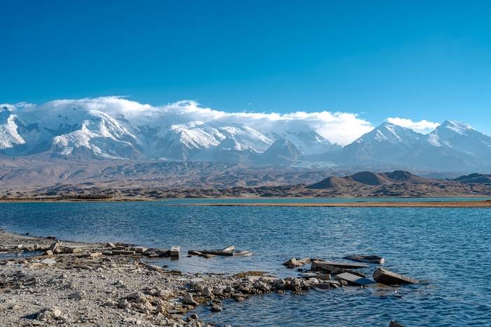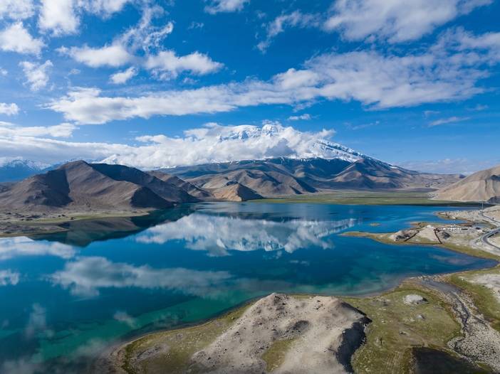 之后前往今天游览的重点【喀拉库勒湖】,喀拉库勒湖位于冰山之父——慕士塔格峰的山脚下,距离喀什191公里。“卡拉库里”意为“黑海”,海拔3600米,是一座高山冰蚀冰碛湖。水面映衬着巍峨又神秘的慕士塔格峰,白雪皑皑,山水同色,景色十分迷人。是世界上少有的高原湖泊。湖的四周有冰峰雪岭环抱,特别是周围的公格尔、公格尔九别峰和慕士塔格峰更为这个湖增添了神奇而美丽的色彩。在风平浪静的日子里,皑皑银峰、绿色草原和湖边畜群倒映在湖中,异常优美。