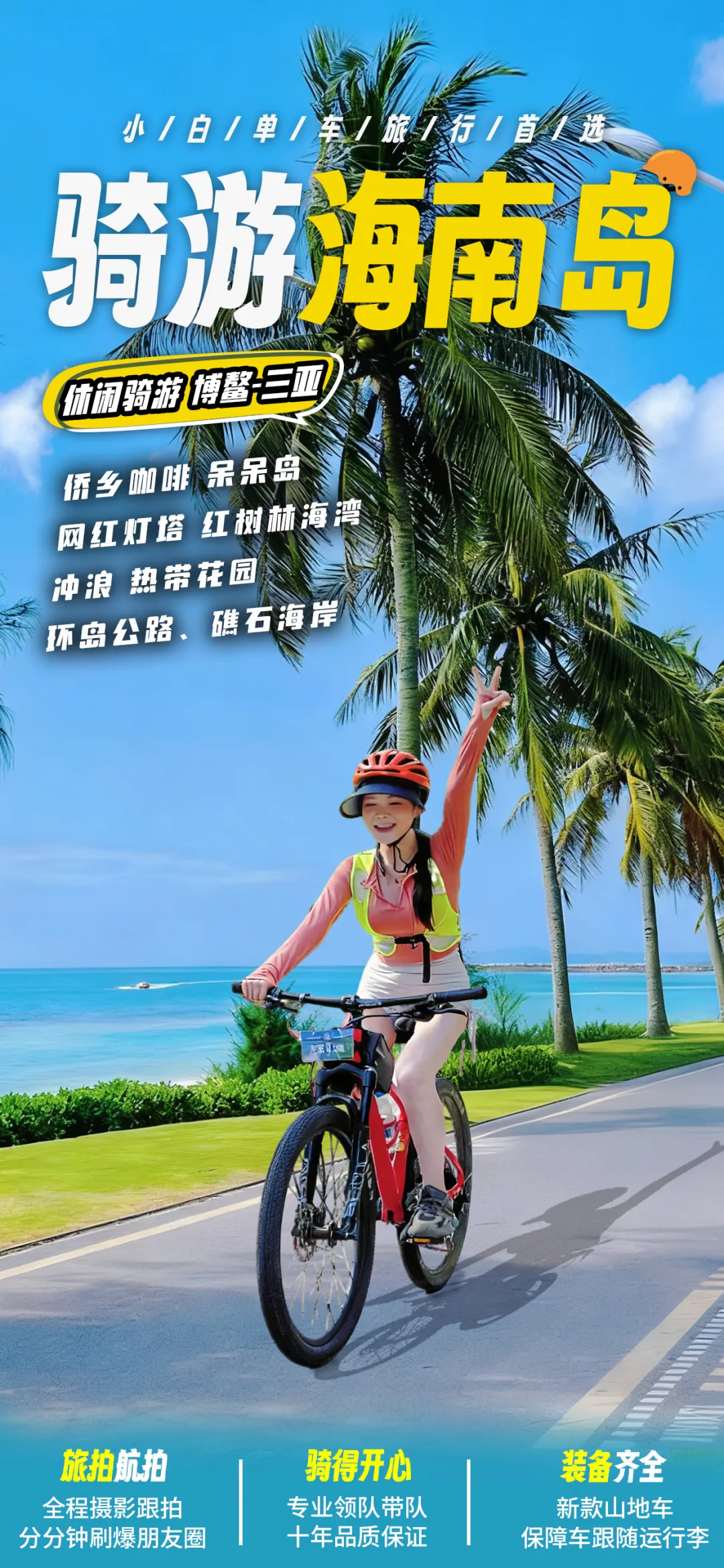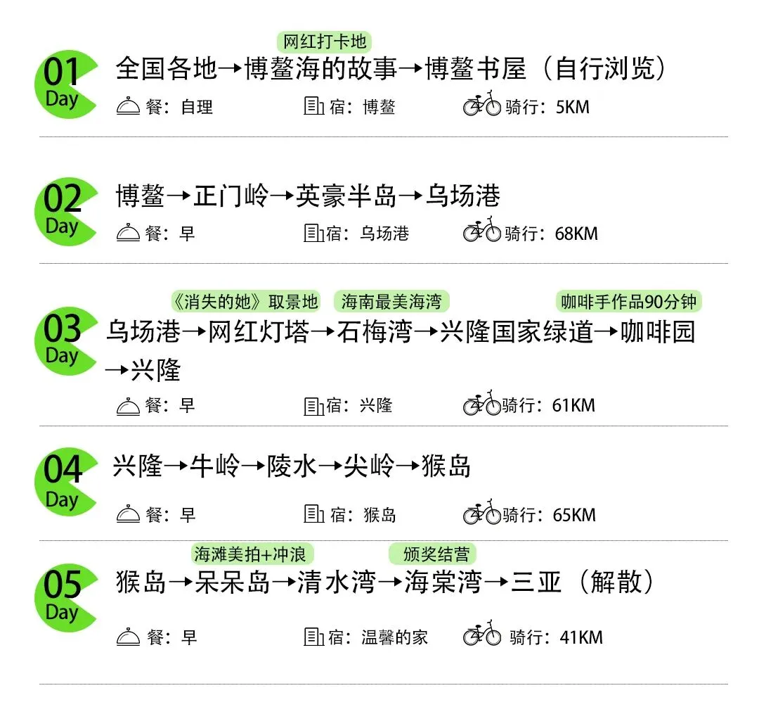 解散时间地点:抵达海棠湾广场结束骑行,颁奖领证书,乘车前往三亚站解散行程(17:00之前抵达三亚站解散,可乘坐三亚17:00之后的火车或18:00之后的航班返程)
