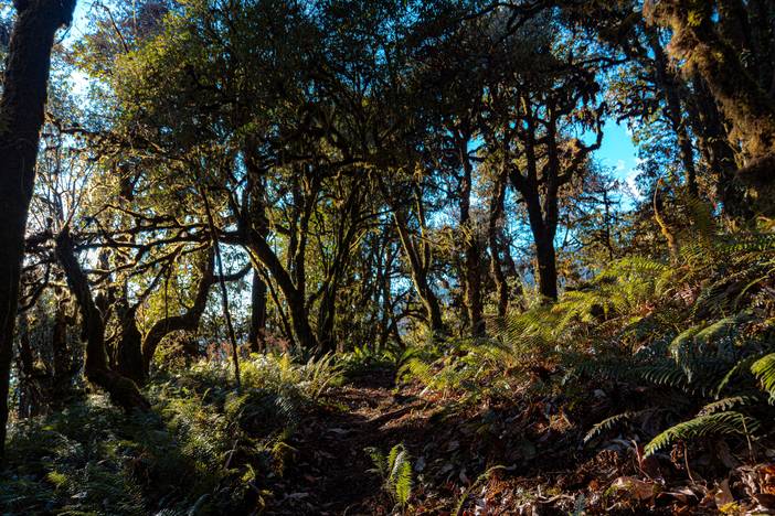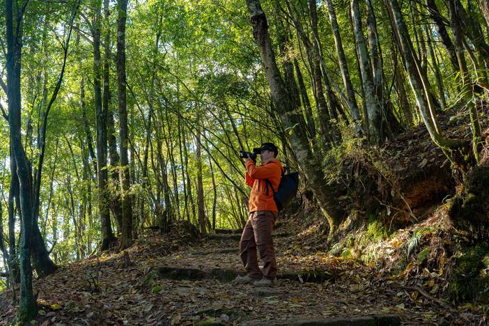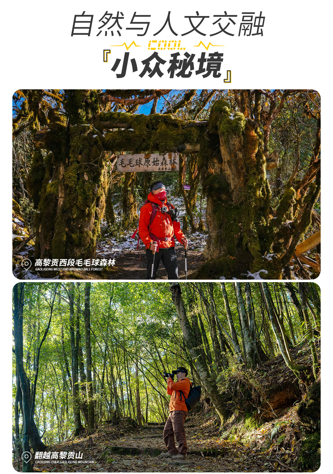 高黎贡山西段毛毛球森林徒步路线因沿途有大量形似 “毛毛球” 的蕨类植物而得名,是一条充满奇幻色彩的徒步线路,也是高黎贡最热门的徒步打卡地。森林中参天古木林立,无数绒球般的苔藓包裹着树干、岩石和小径,形成了独特的苔藓王国。林中还有 “千手观音” 大树群、冷杉、红豆杉和大树杜鹃等珍稀植物,森林深处还有一处天然圆形剧场,能听到山谷的回音。每年3-4月也能看到满山的杜鹃花海。