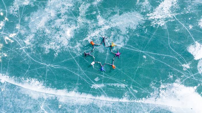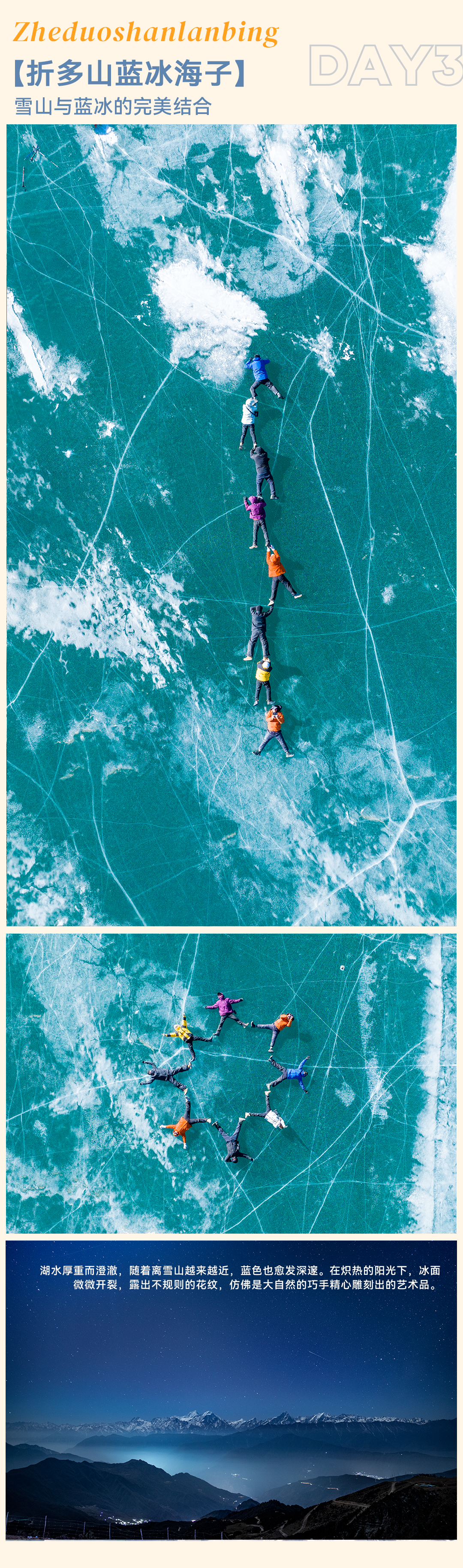 早上乘车出发,天气好时折多塘可以远眺雪山巍峨,折多山沿途路上的风景都很美,行至垭口停车,整理装备向蓝冰海子徒步出发。单程3.5KM-4KM,海拔爬升300M。冬季气候稳定,折多山在进入深冬的时候,海子会完全结冰,冰面绽放出冰花,这个时节天空通透清澈,映衬到一片惊艳的蓝冰海子上,绝美!抵达蓝冰海子后大家拍照留念随后原路返回,正常到达成都时间约为晚上8点。