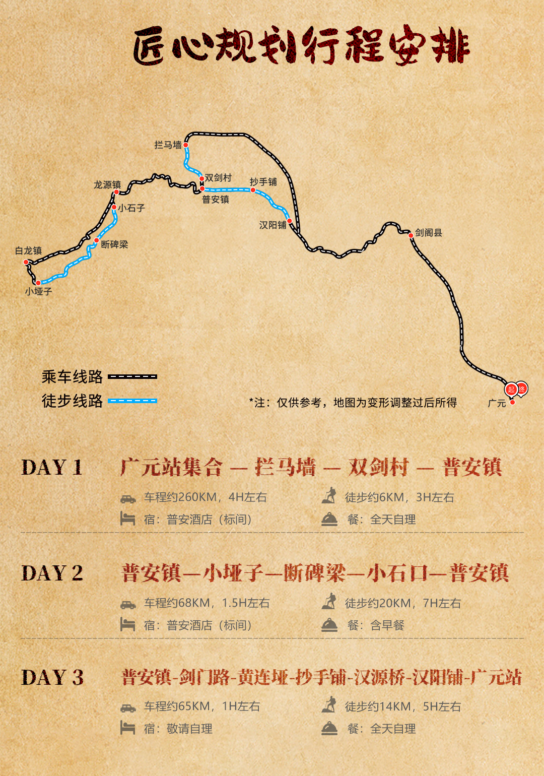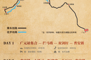 (4)行程第一天中午10点广元集合然后出发,(节假日可能出发时间会比较早)。正常情况下,行程最后一天约下午18点左右抵达广元市,返程注意不要买错票。