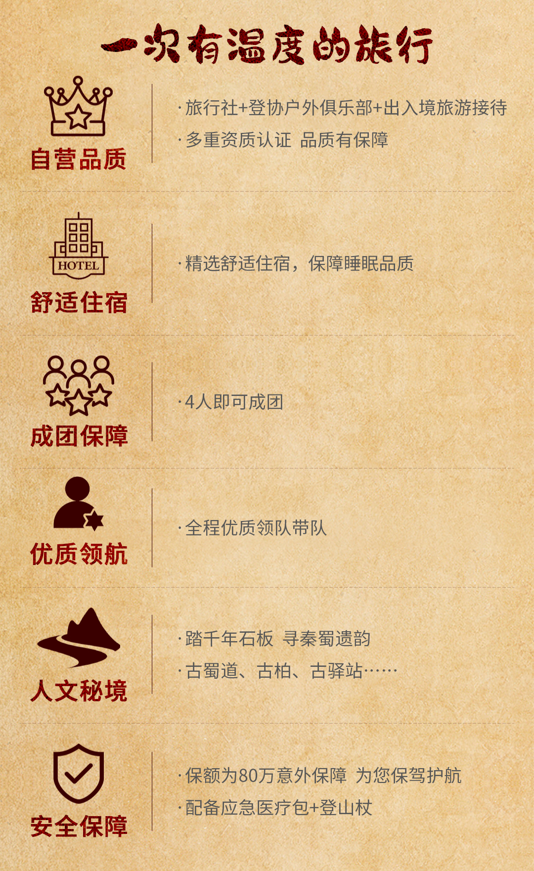 1、这是一条集古蜀道、雄关、古城、古柏、古驿站于一体的顶级人文徒步线路,沉浸式体验中国顶级人文历史长廊。