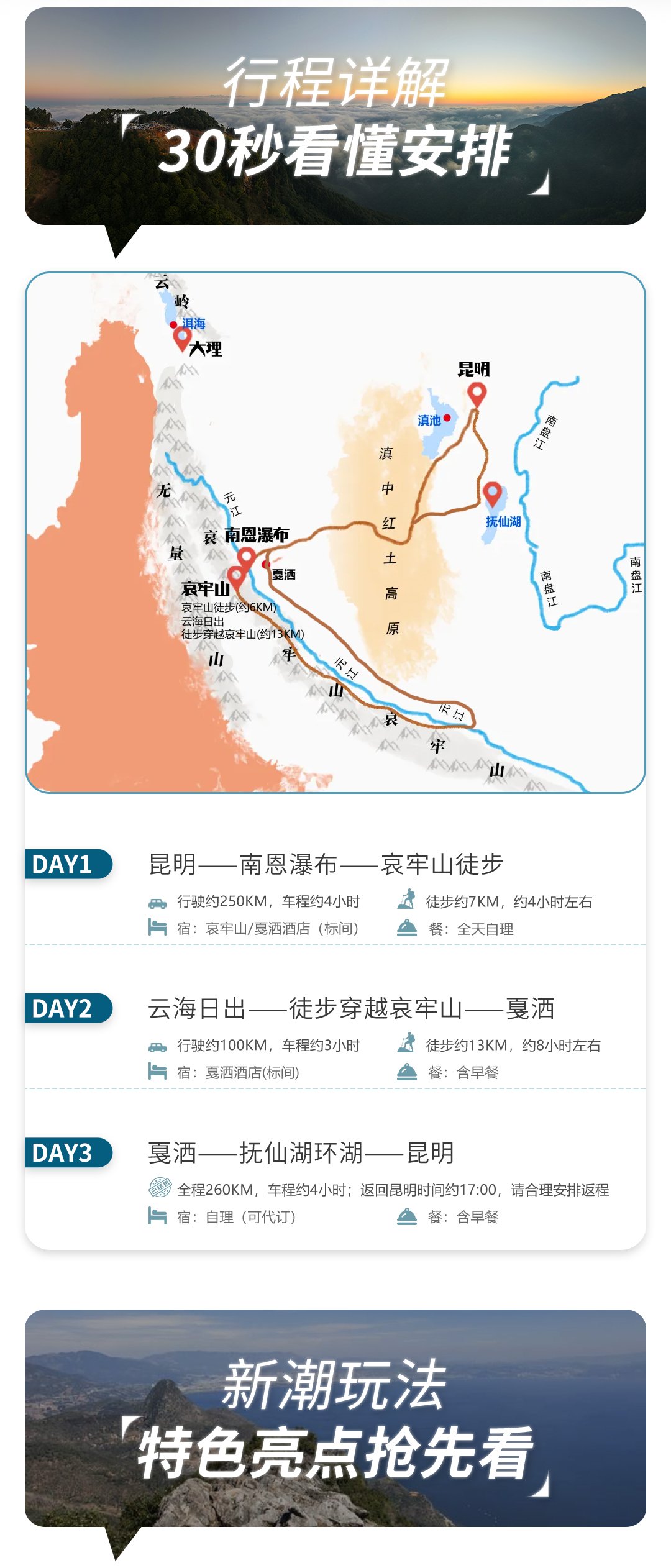 (3)行程第一天为出发日,当天早上8点在昆明火车北站地铁D口集合出发(节假日出发时间会更早)。正常情况下,行程最后一天约17:00抵达昆明散团。