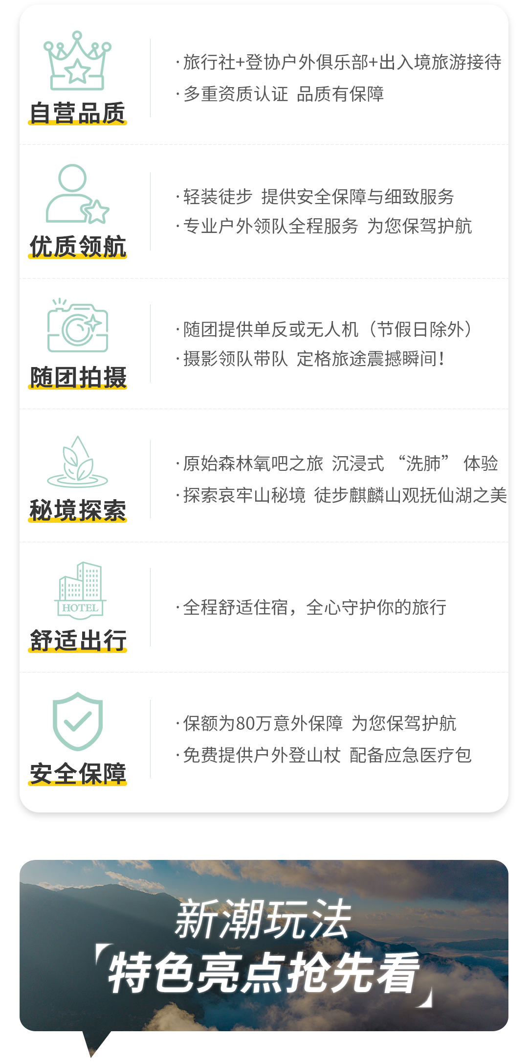 4、工作人员:专业户外领队全程服务(1:10配比),4人以内司机兼领队;