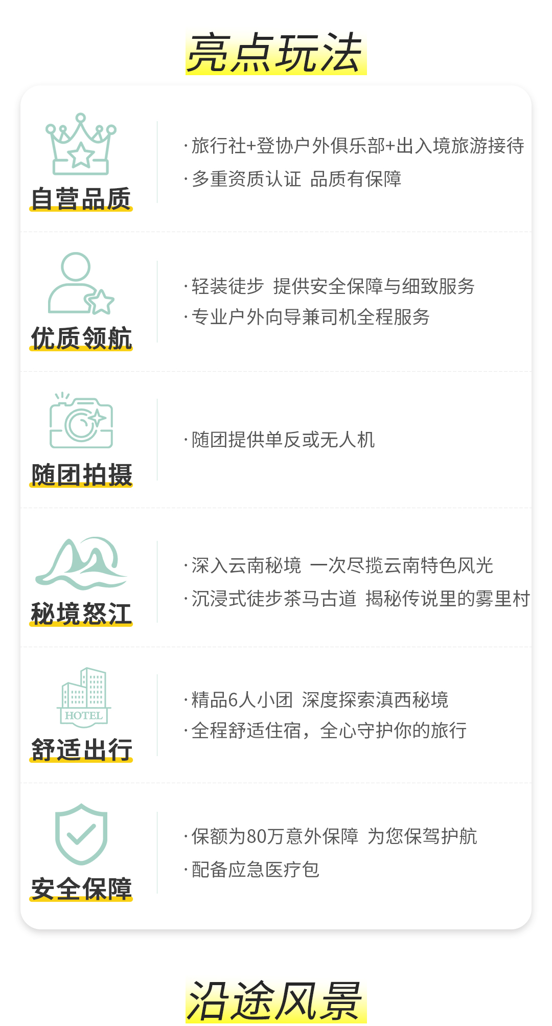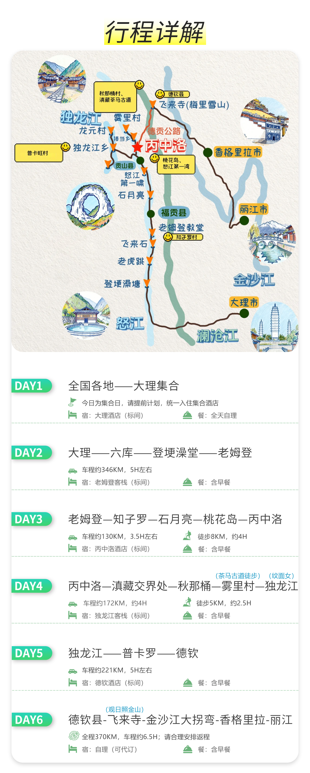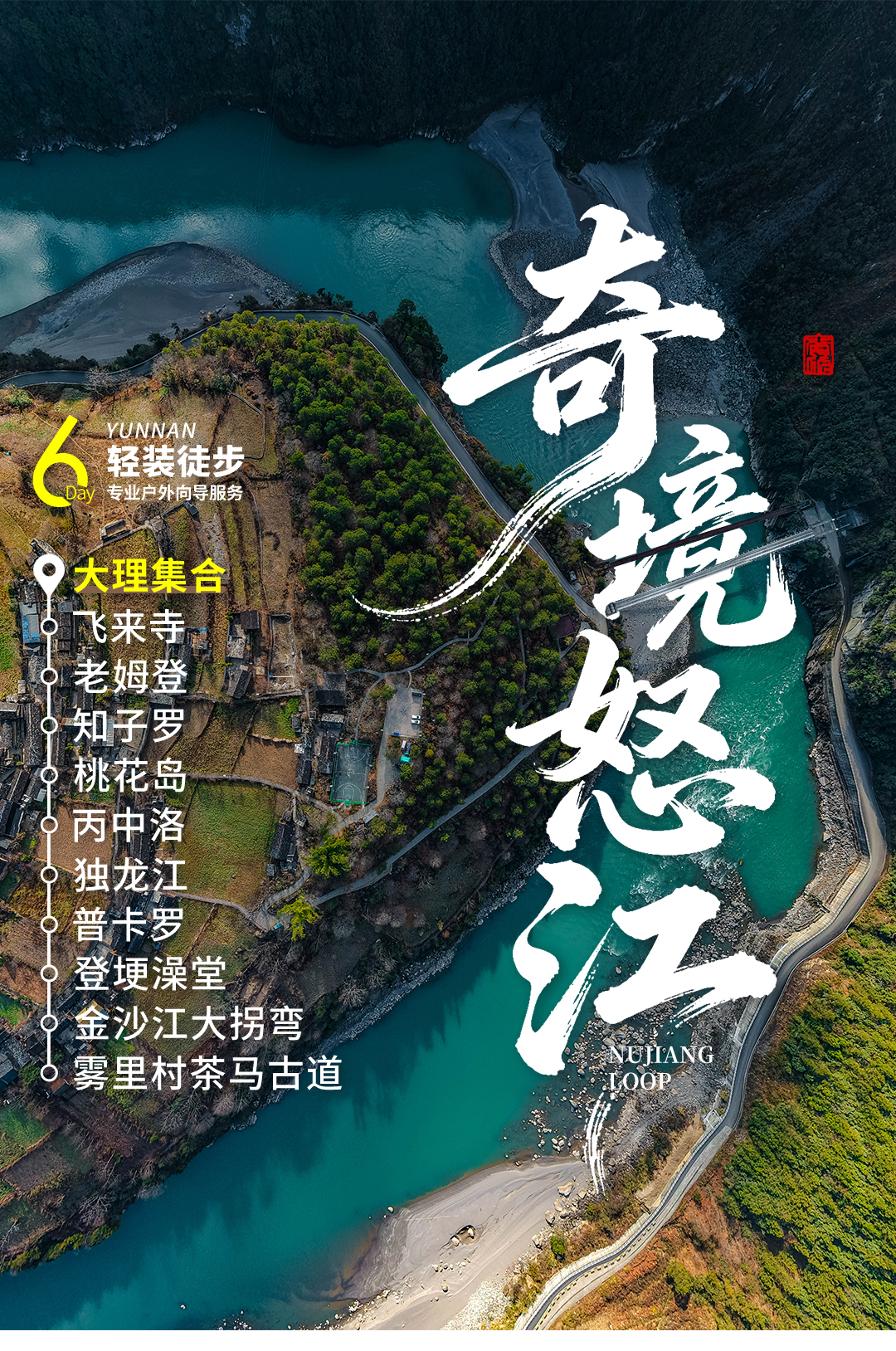 D1:全国各地-大理集合全国各地的队员请自行抵达大理,前往指定酒店集合。早到的朋友可以相约前往大理古城,漫步在青石板路上,感受南诏古国的历史气息,逛逛手工艺品小店,尝尝街头的地道小吃;或前往洱海生态廊道,骑行或散步,享受苍山洱海之间的宁静风光。喜欢文化的队员,也可以参观崇圣寺三塔,了解大理的佛教文化;或探访喜洲古镇,体验白族民居的独特魅力,品尝喜洲破酥粑粑、乳扇等本地美食。傍晚18:30在酒店大厅集合,举行行前说明会,领队将详细介绍行程安排、安全注意事项,并组织大家相互认识。明天,我们将正式开启多彩的怒江之旅! 餐饮:全天自理住宿:大理酒店标间温馨提示:集合信息将在出发前3天以短信的方式发送,请大家保持手机畅通。 D2:大理-六库-登埂澡堂-老姆登早餐后,我们告别大理,乘车沿怒江大峡谷北上。沿途欣赏“东方大峡谷”的雄奇风光,抵达怒江州府所在地六库。稍作休整后,我们将前往体验傈僳族传统野趣的登埂澡堂。这是一处江边露天温泉群,一侧是山崖温泉,一侧是怒江,登埂澡堂在当地人心中享有盛誉,在群山环抱、江水奔腾的背景中,感受天然温泉的浸润,洗去旅途疲惫。之后继续前行,抵达被誉为“云端上的村庄”——老姆登。这里直面高黎贡山北段的皇冠山,我们将入住老姆登的特色客栈,可漫步村庄,探访老姆登基督教堂,在最佳观景台欣赏怒江峡谷的壮丽晚霞,感受怒族村寨的静谧与祥和。 餐饮:含早餐;午餐、晚餐自理住宿:老姆登客栈标间需时:行车约346公里,大约5小时;温馨提示:1、登更澡堂为开放式天然温泉,请自备泳衣及洗漱用品,并注意保管好个人财物;2、老姆登地处山区,早晚温差较大,请注意添衣保暖;3、尊重当地怒族、傈僳族风俗习惯,进入教堂区域请保持安静。
