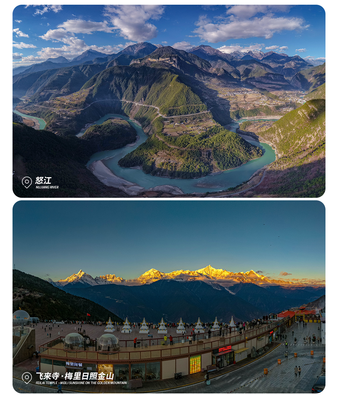 D6:德钦县-飞来寺日照金山-金沙江大拐弯-香格里拉-丽江清晨,我们将早起前往飞来寺观景台,怀着虔诚的心,等待梅里雪山日照金山的壮丽景象。当第一缕阳光洒在卡瓦格博峰顶,整座雪山群被染成金色时,那神圣而震撼的场面,将成为您此行最难忘的记忆之一。这里是藏区八大神山之首,也是无数人魂牵梦绕的朝圣地,相传看见过梅里十三峰日照金山的人能幸运一整年。日出结束后我们返回酒店,稍作休整后告别梅里雪山,沿着214国道(滇藏公路)南下。途中将经过金沙江大拐弯,在观景台俯瞰江水在这里划出的壮丽“Ω”形曲线,感受大自然的鬼斧神工。下午途径香格里拉后我们抵达丽江,结束本次愉快的行程。 餐饮:含早餐;午餐、晚餐自理住宿:敬请自理需时:行车约370公里,约6.5小时;海拔:飞来寺观景台约 3450米、丽江古城约2400米温馨提示:到达丽江时间约为下午6点半,如需当天离开的朋友请合理规划返程的交通。
