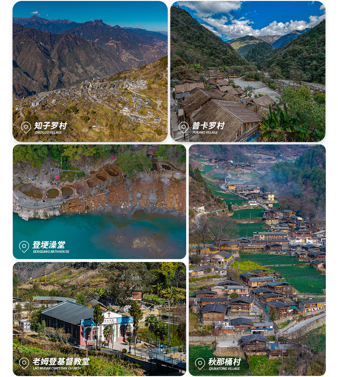 D3:老姆登-知子罗-石月亮-桃花岛-丙中洛清晨,可自愿早起观赏老姆登的云海晨雾与皇冠山日照金顶的壮丽景色。早餐后,我们首先前往被时光定格的“记忆之城”——知子罗。漫步于这座保存着上世纪七八十年代风貌的旧县城,在八角楼前俯瞰怒江峡谷,感受一段特殊的历史记忆。随后乘车沿美丽公路继续向北深入。途中将在最佳观景点远眺鬼斧神工的石月亮——高悬于高黎贡山之巅的巨型大理岩穿洞,聆听傈僳族关于它的古老传说,这也是抗日历史上驼峰航线上的重要地标。下午,我们抵达怒江第一湾畔的桃花岛(扎拉桶村)。通过吊桥进入这个三面环水的宁静村落,在桃花盛开的季节(一般为每年3月),这里宛如与世隔绝的秘境;其他季节则绿意盎然,别具古朴之美。我们将在这里稍作停留,感受傈僳族田园生活的静谧。傍晚时分,抵达“人神共居的居所”——丙中洛。入住客栈后,若时间与天气允许,可前往贡当神山观景台或雪山观景台,欣赏夕阳余晖洒在丙中洛坝子、村落与远处嘎娃嘎普雪山之上的绝美画卷。 住宿:丙中洛酒店标间餐饮:含早餐;午餐、晚餐自理需时:行车约220公里,约4小时;温馨提示:桃花岛景色季节性较强,春季桃花盛开景观最佳,其他季节以体验村落原生态风貌为主。