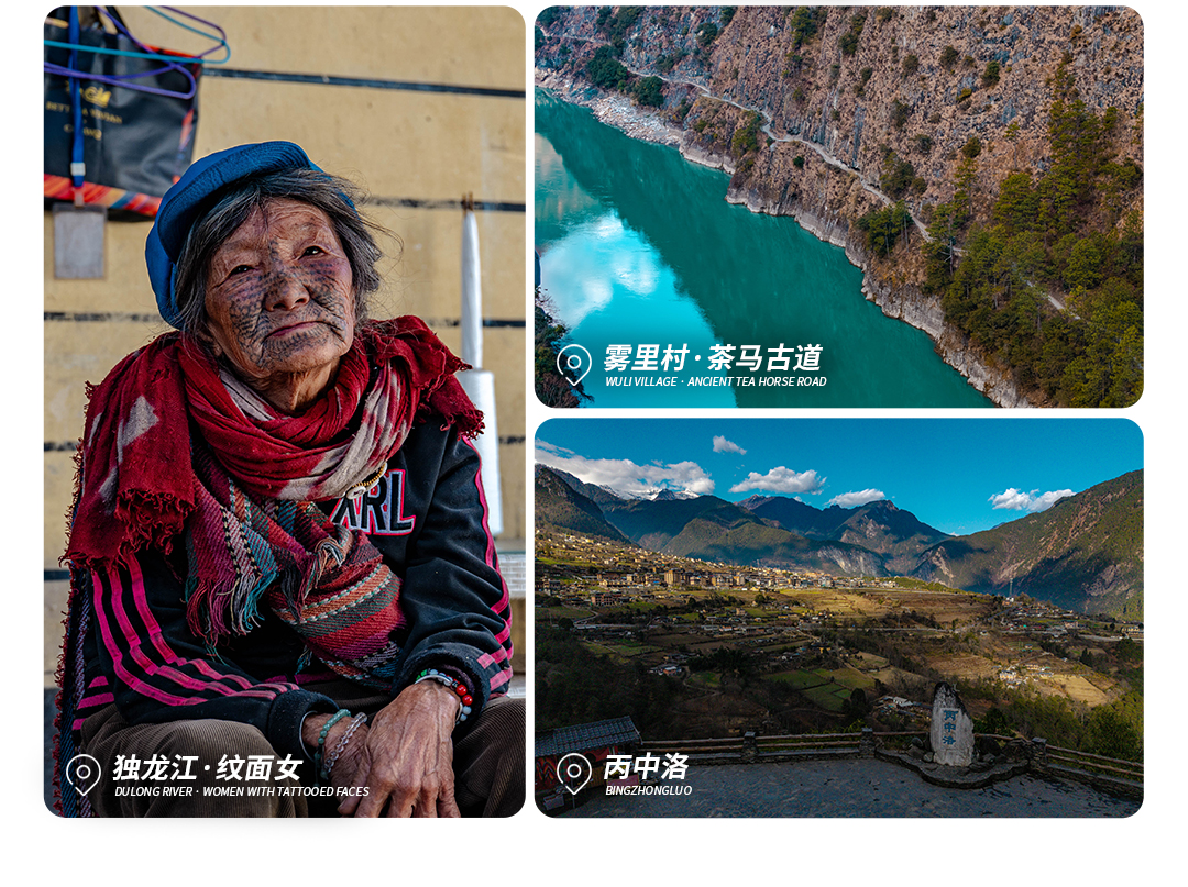 D4:丙中洛-滇藏交界处-秋那桶-雾里村茶马古道徒步-独龙江(纹面女)早餐后,我们正式踏上丙中洛的秘境探寻之旅。首先驱车前往滇藏交界处,感受一脚踏两省(自治区)的独特体验。随后,我们前往被誉为“中国最美的村庄”之一的秋那桶。原始的木屋、青稞架与教堂在山雾中若隐若现,构成一幅宁静的田园画卷。在这里,可以感受到怒族村落最纯粹的宁静与祥和。离开秋那桶后,开启寻找雾里村茶马古道的徒步。穿过朝红桥跨到怒江对岸后开始徒步,穿越一段悬崖之上的茶马古道,这也是唯一一条能通往雾里村的悬壁古道。雾里村,这个被称为“瑞士田园风光”的原始村落,三面环山、一面临江,古道险峻而壮美,走在其中,仿佛能听见历史的回响与马帮的铃声。离开雾里村,我们继续出发,前往独龙江寻访纹面女,纹面女是独龙族特有的古老文化传统,如今仅存的纹面女已为数不多。我们有幸的话,将走进她们的家中,聆听她们讲述纹面习俗背后的历史与传说,感受独龙族文化的独特魅力与即将消逝的传统。 餐饮:含早餐;午餐、晚餐自理住宿:独龙江客栈标间需时:行车约172公里,约4小时;徒步约5公里,约2.5小时;