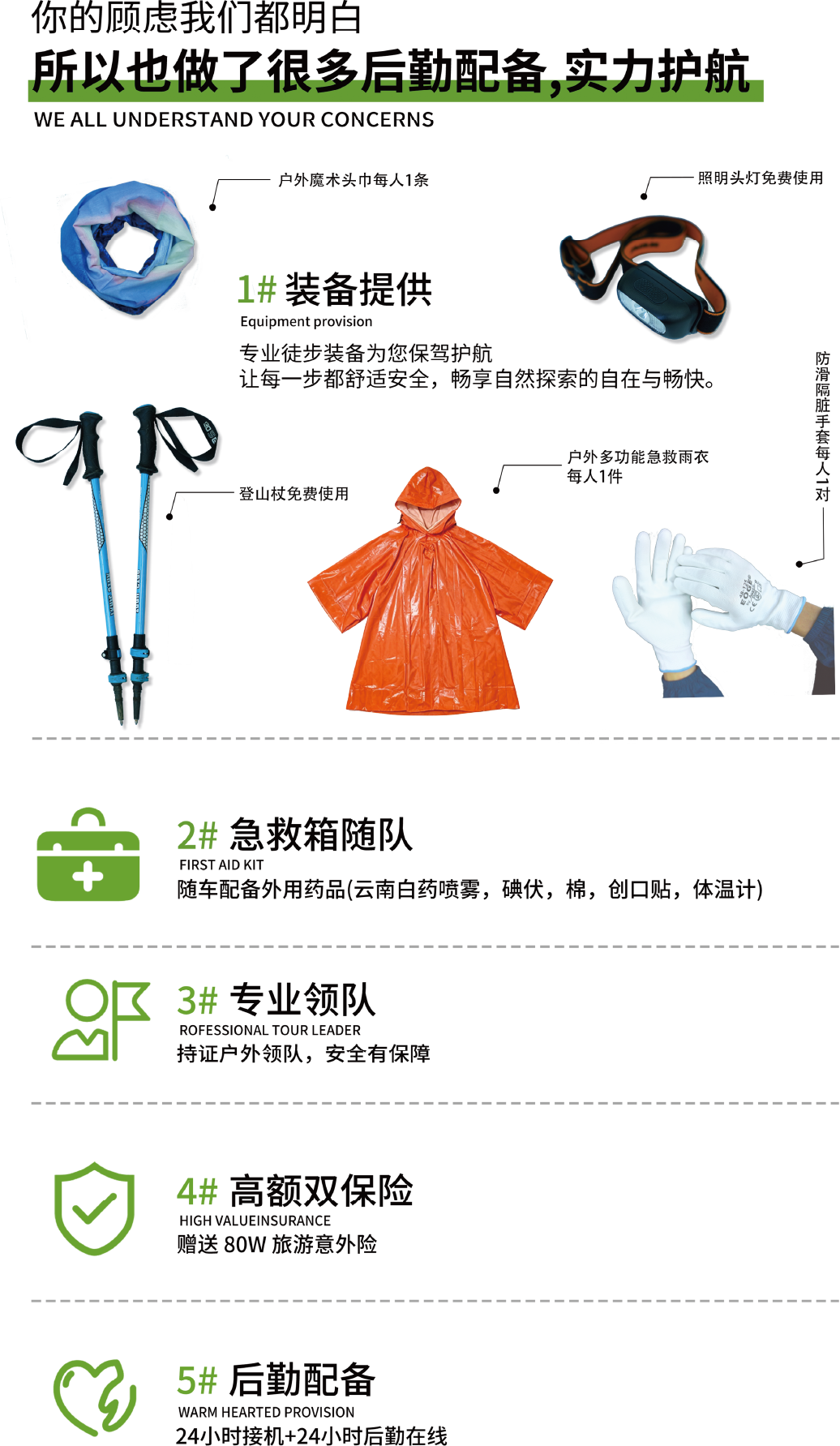 3、活动装备:头灯/登山杖各一件免费租借(用后回收,如需要双杖请提前告知);赠送头巾/手套、户外多功能急救雨衣(不回收)。