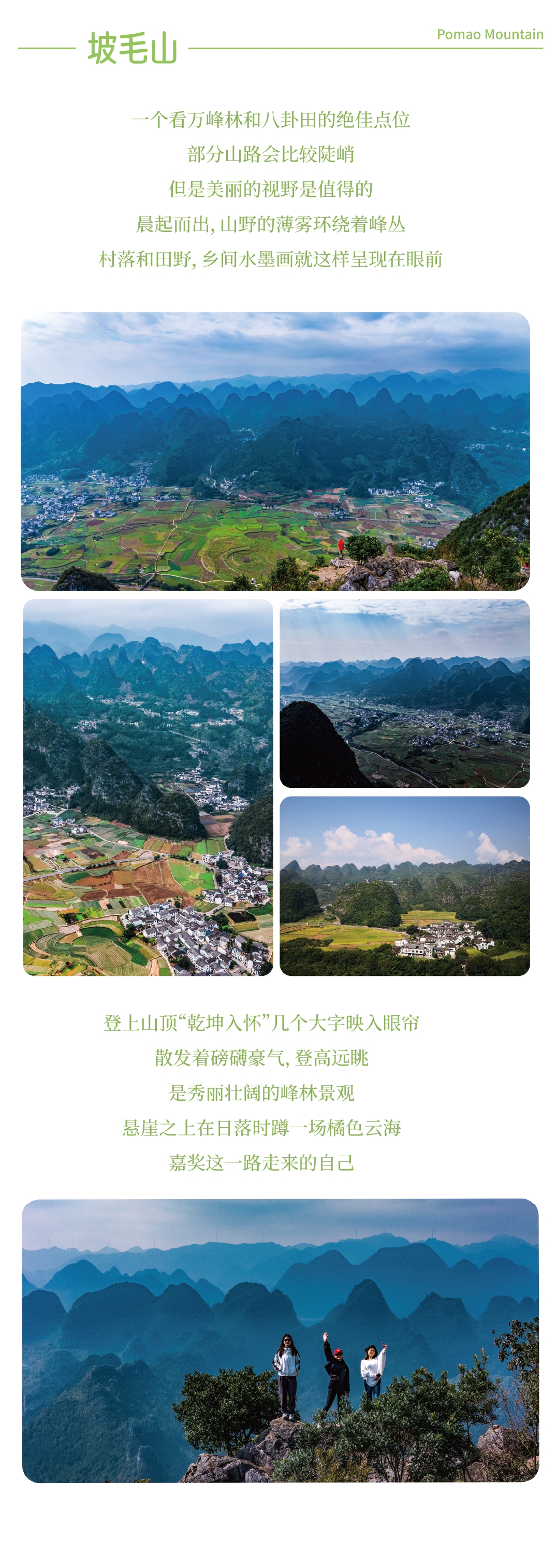 早餐后,前往【坡毛山】徒步登顶,俯瞰八卦田与万峰林构成的“千里江山图”;环线下山后,乘车至【万峰林】电动车骑行起点。骑电动车穿梭纳灰古寨与田野,沉浸式游览“中国最美峰林”,可随时停车打卡。骑行结束后,前往指定场地举行庆功宴,分享行程喜悦;宴后按统一安排——兴义南站、贵阳龙洞堡机场、贵阳北站等返程。行程至此圆满结束,山高水长,后会有期!
