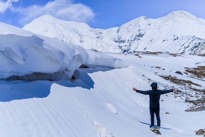 上午唐卡讲解体验,之后乘车前往徒步起点知亥代营地开始徒步,抵达知亥代尼合垭口观景台后,开启进入冰川深度探索之旅,立于垭口的当雄冰川如玉带垂落,又宛如一条巨大的冰河从垭口底部向上延伸——这是黄河流域最大的冰川之一。晚上住当雄旅馆欣赏当雄冰川日落,巍峨的冰川在灿烂的日光下熠熠生辉。