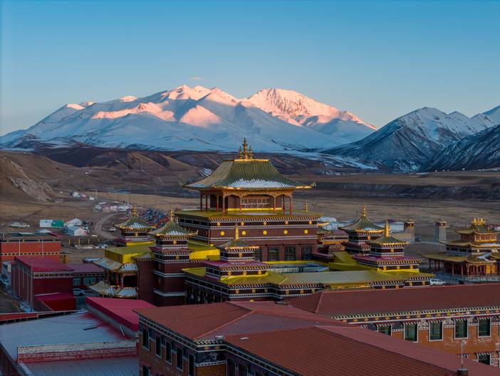 早餐后从扎西拉唐徒步出发,途径巍峨的魔界峰,山石嶙峋尽显苍劲;邂逅刻满经文的石经墙,千年信仰凝于石间风吹过皆是虔诚;偶遇天然形成的猛虎下山象形图,大自然的鬼斧神工让人叹为观止。徒步结束后乘车往前阿尼玛卿藏族文化中心,去感受一下这张矗立于雪山脚下的藏式宏伟圣殿,同时也是世界首座阿尼玛卿圣殿。在这里可以看到圣殿与阿尼玛卿雪山群的完美呈现,日落时分尤其壮观。