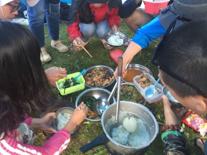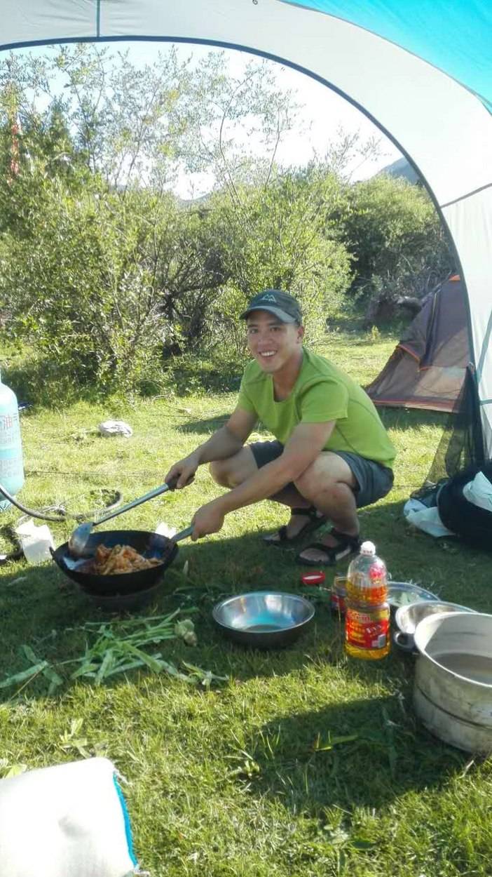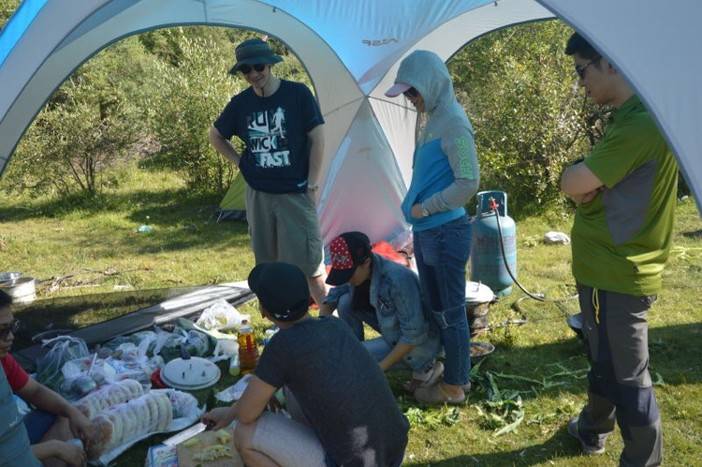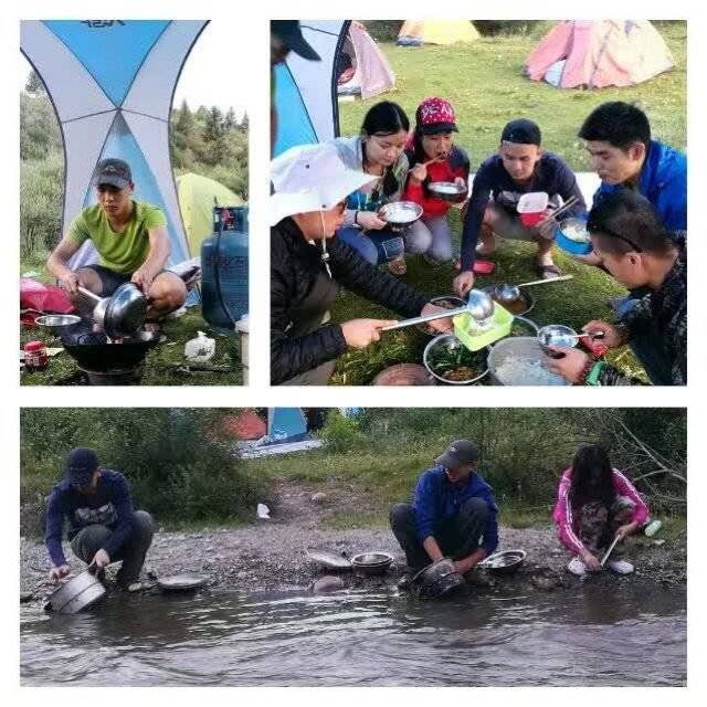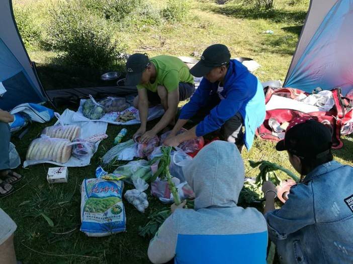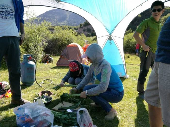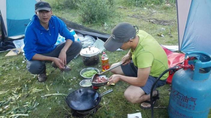 无论在哪里吃是少不了的。清点物质,准备做行程第一顿饭。怀抱自然的第一天,对一切都是那么的好奇,平时不做饭的伙伴们都跃跃欲试,洗菜,洗锅,做饭,炒菜一切都是有条不紊的进行着。