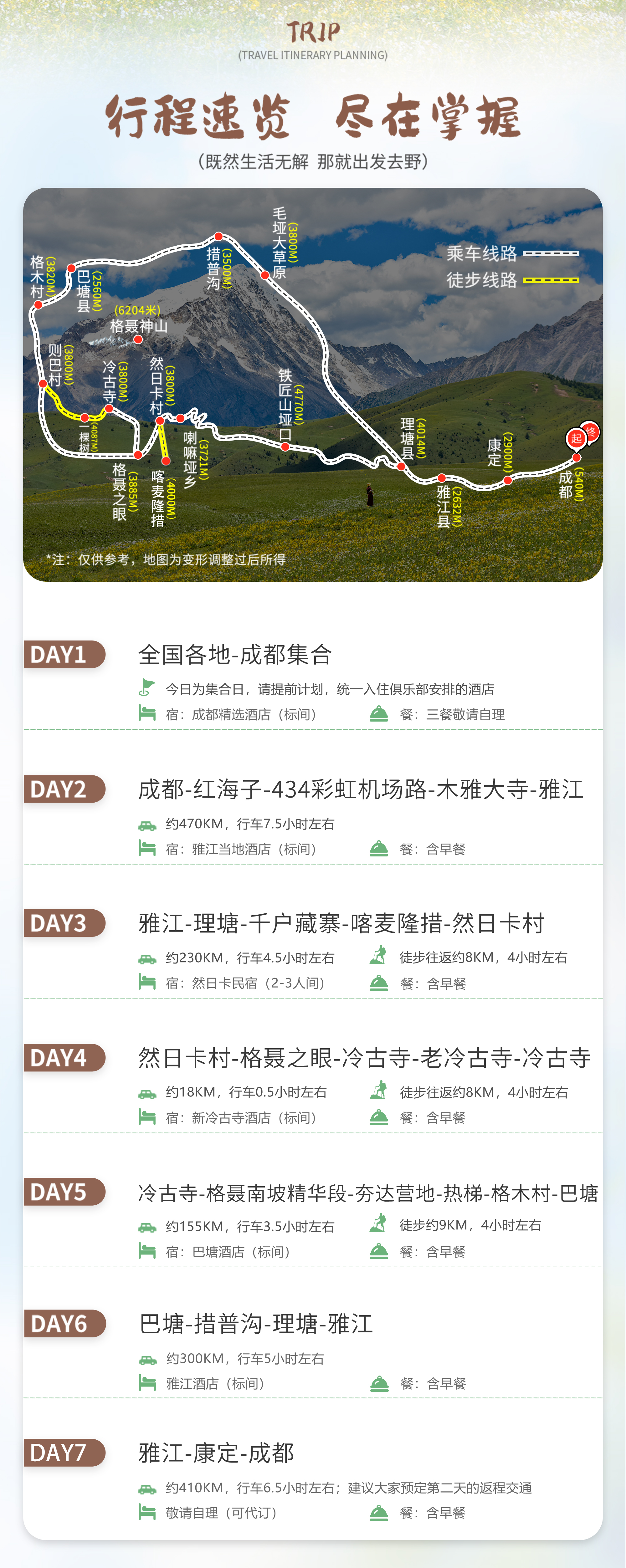 (1)全程徒步约25公里,平均海拔为3800米左右,住宿最高海拔为3920米。
