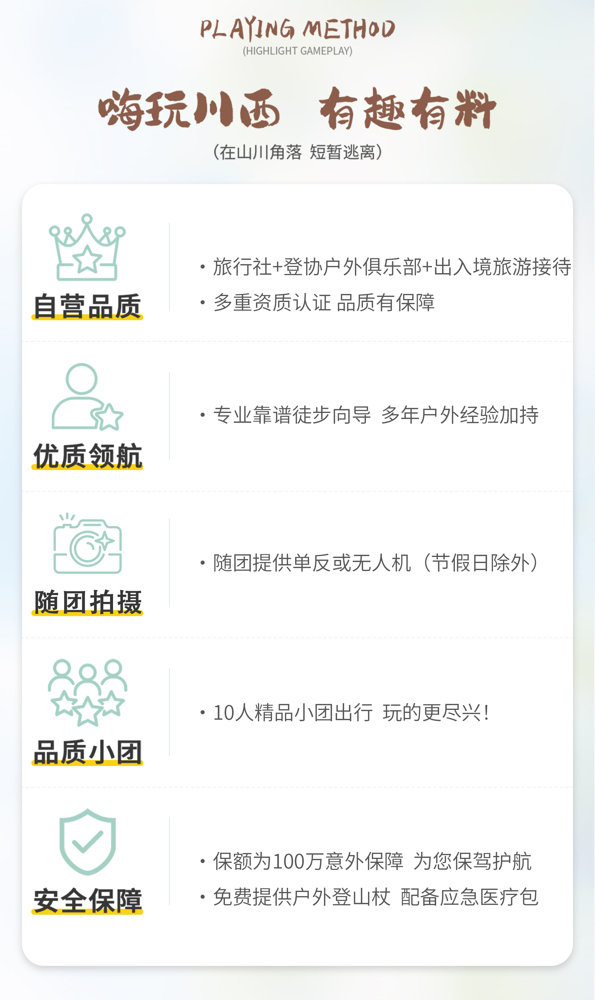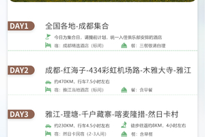 (3)行程第一天为成都集合时间,当天到成都就可以,第二天早上在集合酒店出发。正常情况下,行程最后一天为下午5点左右抵达集合酒店散团。