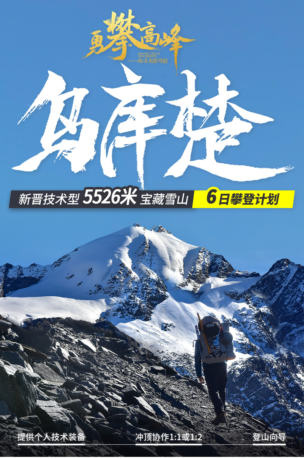 乌库楚山峰海拔5526米,因其丰富的地形,攀登体验感极佳,在川西众多雪山中,其良好的接近性实属难得,四驱越野可以直接开到海拔4300米的大本营(成都出发一天可到大本营),给后勤保障带来了极大的便利,但这也会造成海拔上升太快,身体适应海拔难度加大,我们会在山下村子里住2晚适应,第三天再上大本营,让大家有足够的时间,科学地适应高原环境,为接下来的攀登做好准备,乌库楚是继那玛峰之后又一座接近性好,攀登时间短,技术体验极佳的雪山!