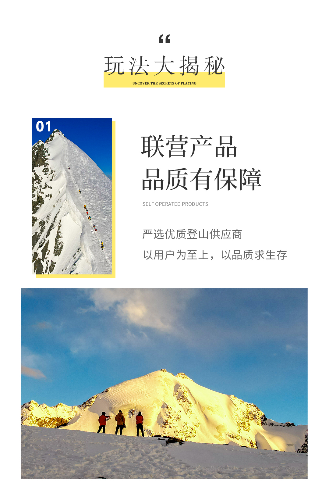 主绳、辅绳、冰锥、雪锥、头盔、安全带、主锁、牛尾绳、上升器、下降器、行走冰镐、冰爪。(提前报名者免费使用登山杖、雪套、头灯)
