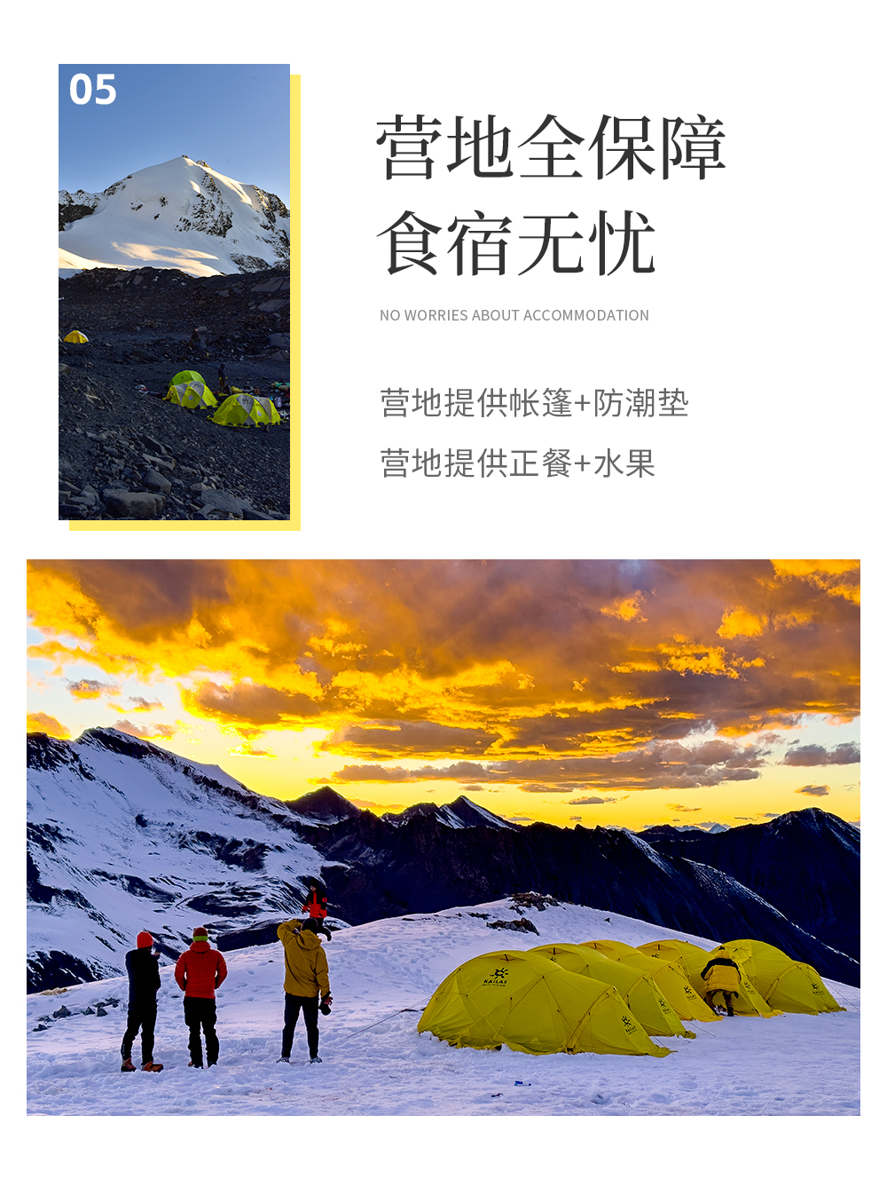 (1)全程徒步约15公里,平均海拔为4900米左右,攀登最高海拔为乌库楚主峰5526米,住宿最高海拔为C1登山营地约5000米左右。