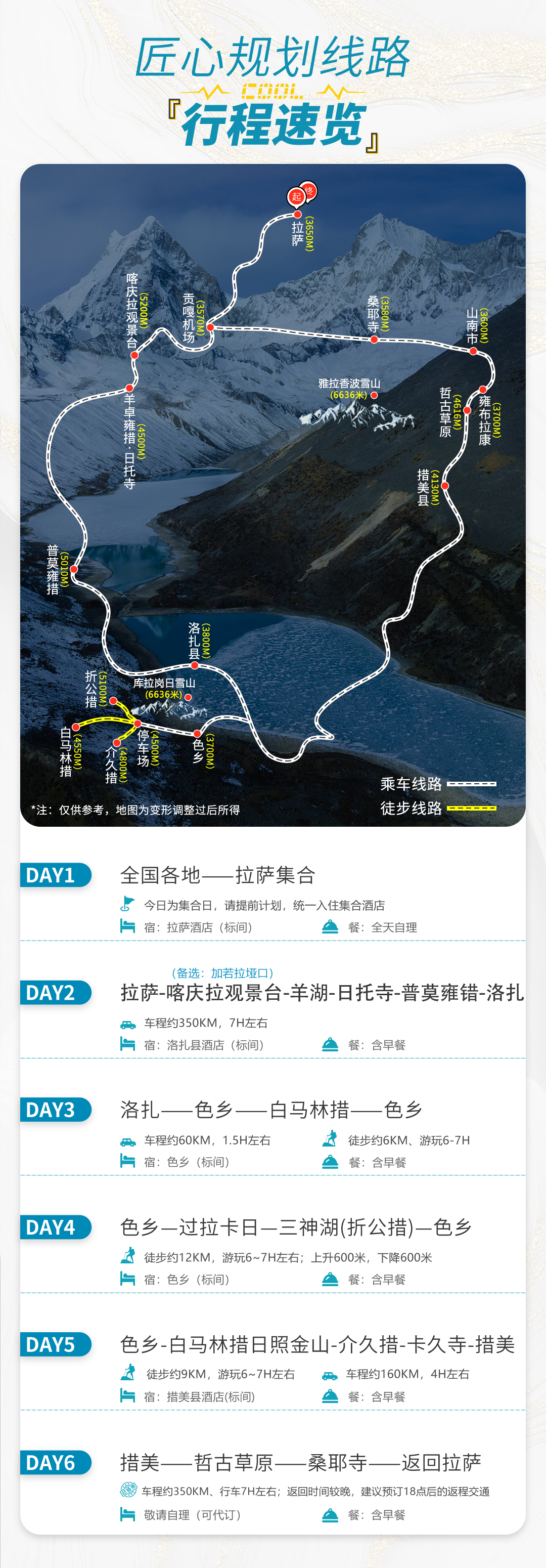 1、措玉村海拔4160米,停车场海拔4500米,今日徒步约6公里,可慢行慢拍,如果感觉不舒服,也可只在湖边周围拍照,从停车场至湖边只需十几分钟。