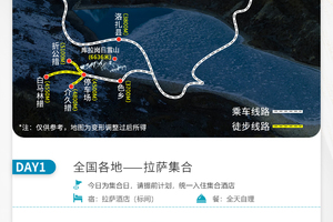 今日全国各地的队友将来到拉萨集合,统一入住我俱乐部安排的酒店。如果您的时间比较宽裕,可以自行安排在拉萨市区的旅游活动,拉萨火车站距市区10公里,可打车到集合酒店。贡嘎机场距拉萨市区65公里,可乘坐机场大巴到拉萨贡嘎机场乘车点民航局门口下车,再打车到集合酒店办理入住。当天尽量少运动,多休息。晚上会统一召开行前见面会,讲解本次活动注意事项。