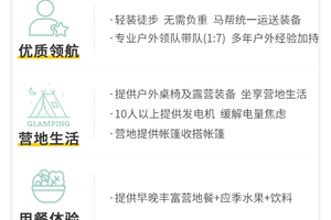 6、工作人员:专业户外领队全程服务(1:7配比)、后勤保障人员;