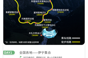 今日全国各地的队友将来到伊宁集合,统一入住我俱乐部安排的酒店,时间充裕的小伙伴可以选择去六星街、喀赞其民俗旅游区、伊宁丝绸之路文化旅游城、紫苏丽人薰衣草创意产业园、拜吐拉清真寺宣礼塔等地游玩。晚上给大家检查装备、行前准备会议。新疆特色美食推荐:手抓羊肉、手抓饭、烤馕、烤包子、馕坑肉、大盘鸡、椒麻鸡、烤包子、拌面、拉条子等