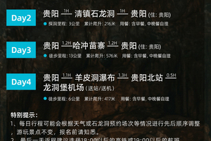 (3)行程第一天为贵阳集合时间,当天抵达贵阳就行。行程最后一天返程建议选择18:00以后的高铁或19:00以后的航班(高铁请预留45分钟进站乘车,飞机则至少留1.5小时办理乘机)。