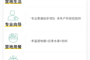 3、餐饮:全程所有餐费共计6早5正,如行程中所列(营地晚餐2荤2素1汤,营地提供饮用热水,营地早餐为粥、榨菜、鸡蛋等);