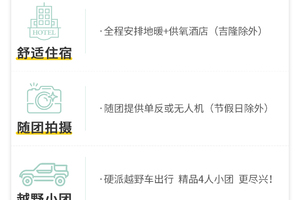 1、交通:全程往返交通费用,越野车出行(同期最多4车同行);