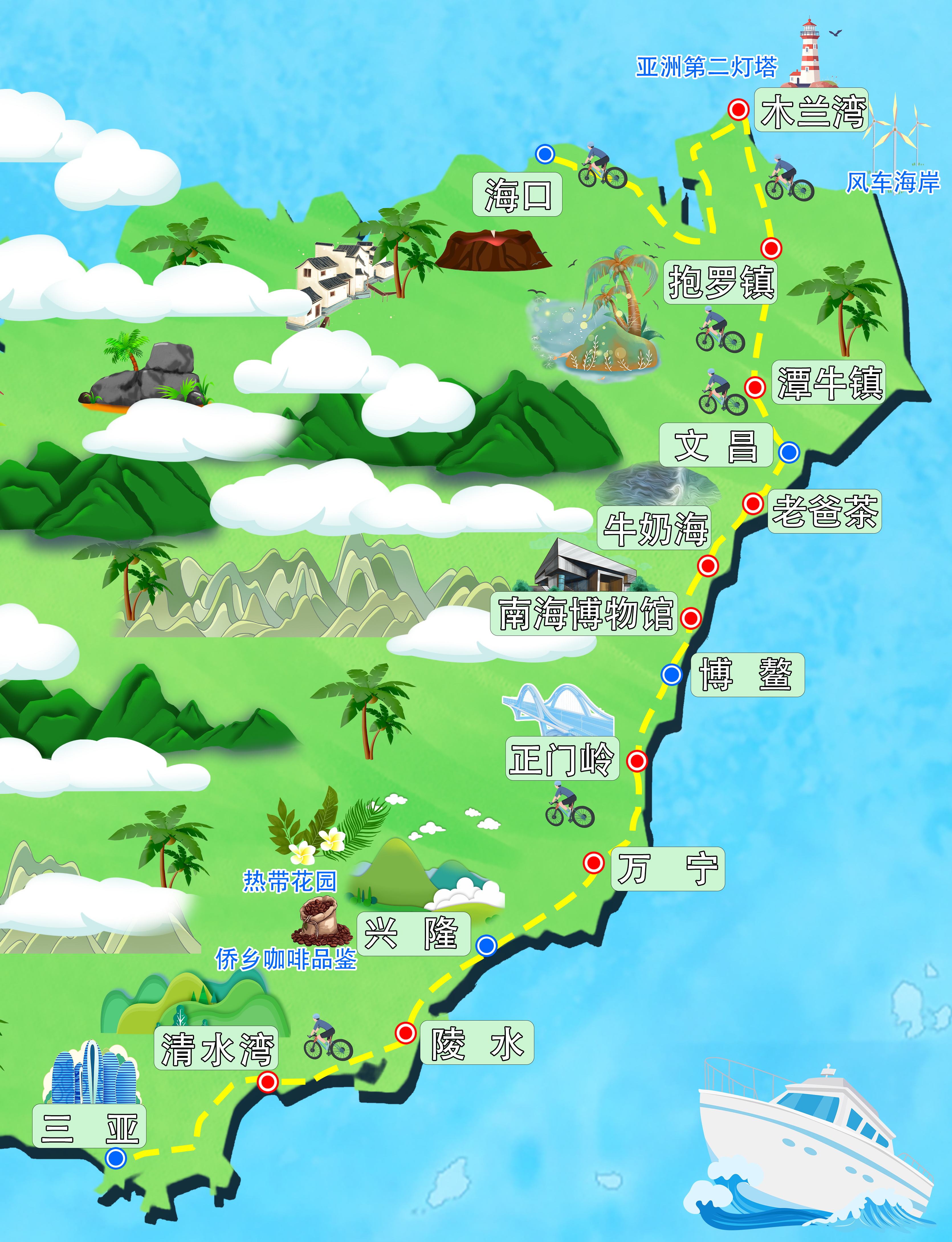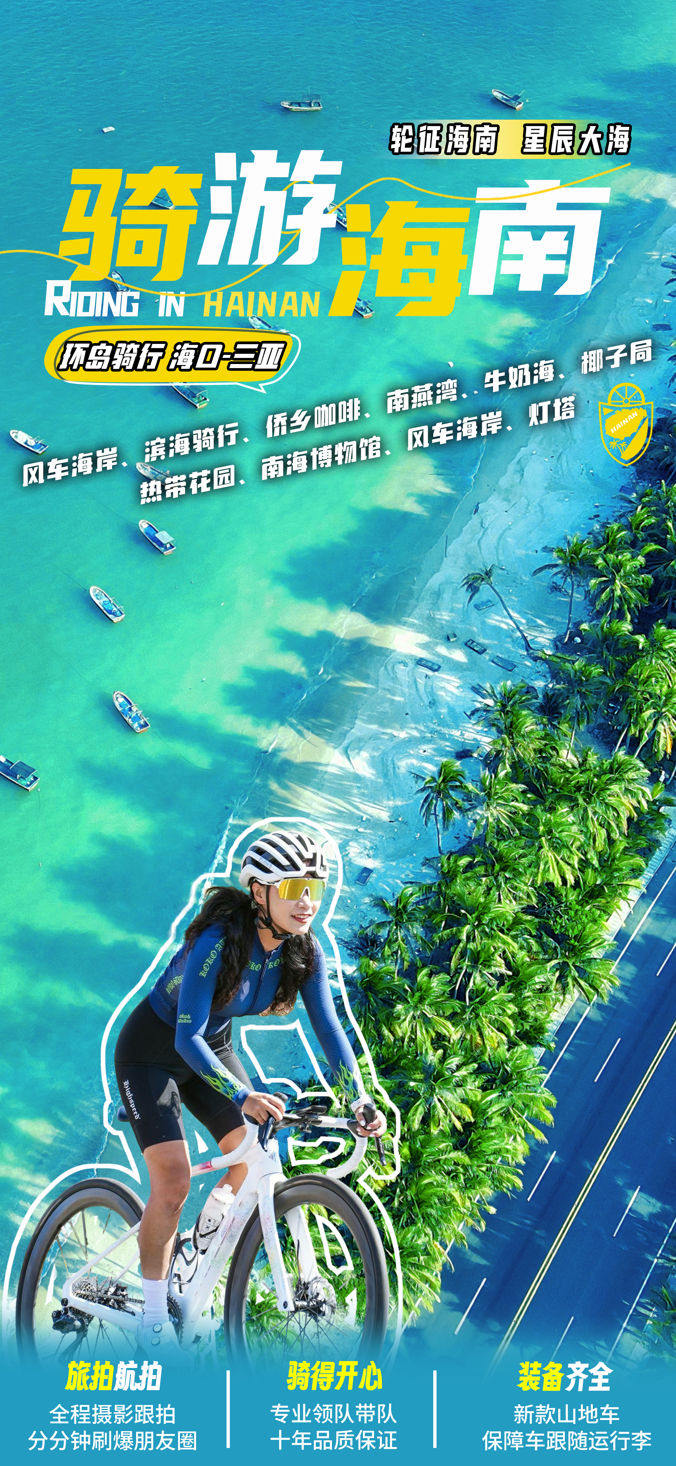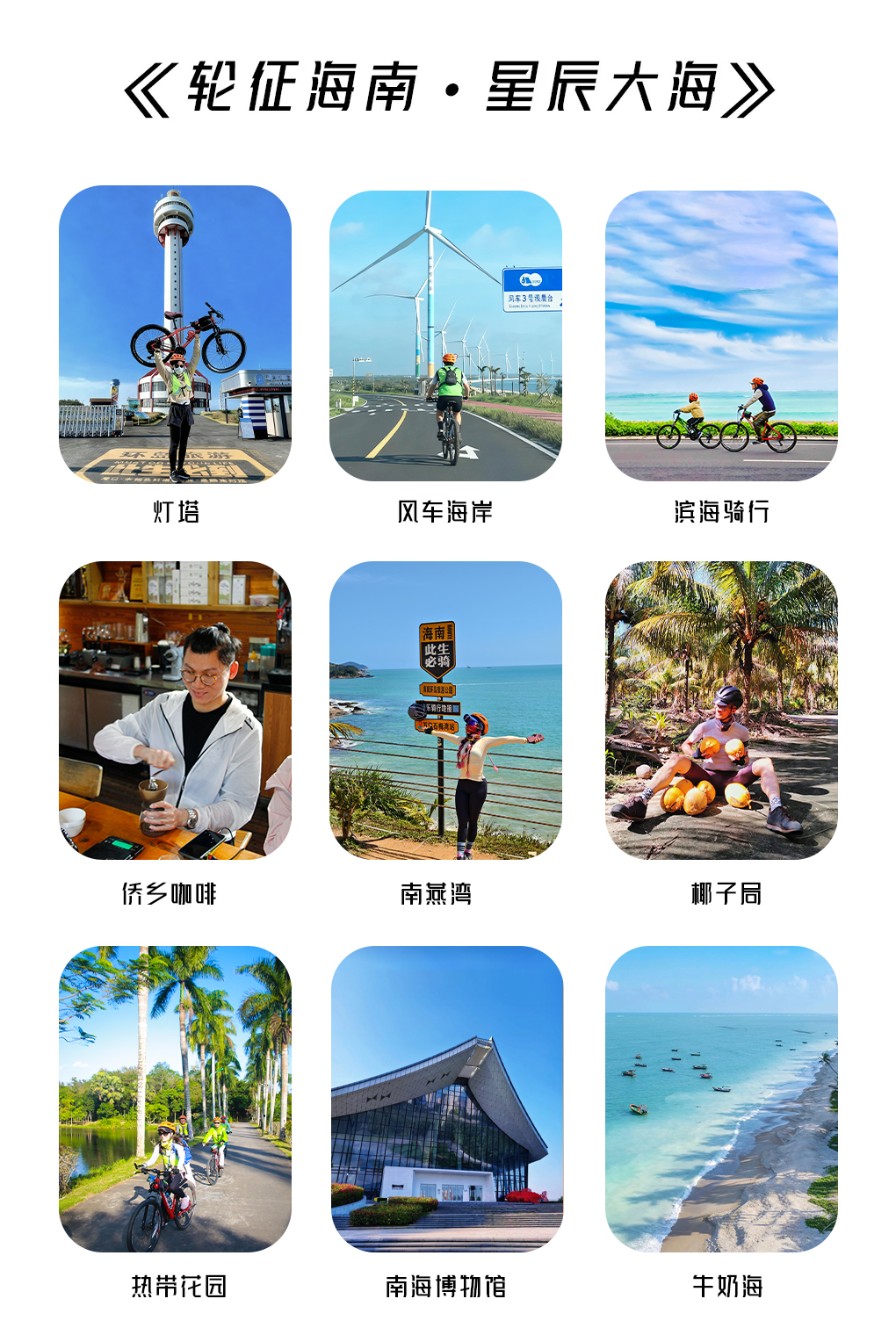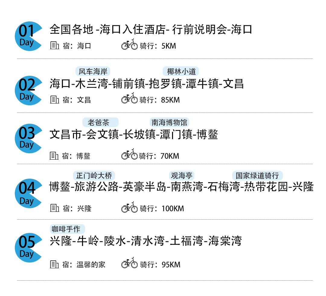 在兴隆的咖啡庄园品鉴侨乡咖啡,了解咖啡文化吃点心,度过慵懒时光。之后小伙伴们相互鼓励,一起加油爬陵水大坡,翻越牛岭,至此我们告别亚热带季风区,进入了真正的热带。中午在陵水市区尝尝《舌尖上的中国》推荐的陵水美食-酸粉。下午沿奢华海景房清水湾、土福湾一路骑行,抵达三亚海棠湾广场,预计18点左右结束骑行,在不堵车的正常情况下,可乘坐三亚机场晚上9点30分之后的飞机和8点之后的高铁返程。颁奖领证书,结束我们的海南骑行之旅。