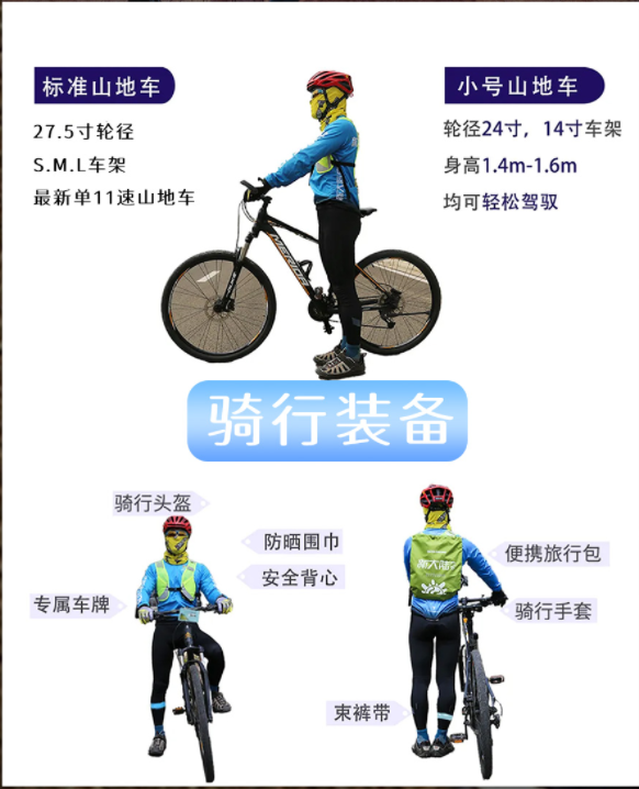 该线路为常规骑游线路(非亲子营/儿童独立营),该线路仅提供24寸及27.5寸轮径的山地自行车,报名儿童需要具备骑行经验,能独立骑行,有安全责任意识,并满足以下两个条件中的一个:12岁及以上或身高140厘米及以上(二选一),在行程中遇到危险路段和必要情况听从领队安排坐保障车。