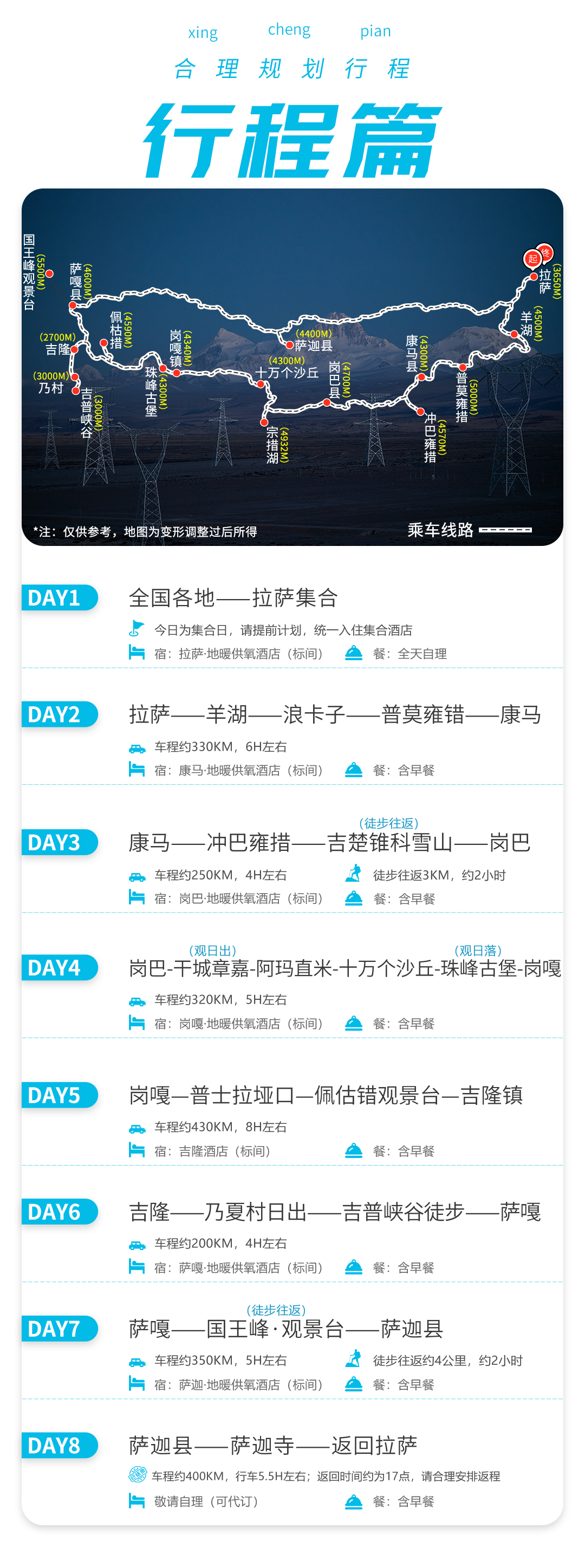 (1)沿路住宿均为当地酒店标间,除吉隆县外均为供氧酒店。