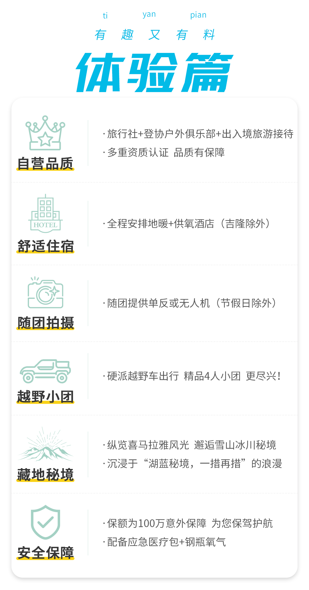 1、串联318、219国道,纵览喜马拉雅风光,雪山、圣湖、冰川、寺庙等景观全覆盖,满足对西藏的所有想象。