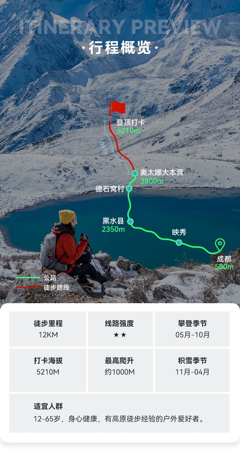 (1)全程徒步约12公里,最高海拔为峰顶5210米,住宿最高海拔为黑水县2350米(大本营约3800米左右。)