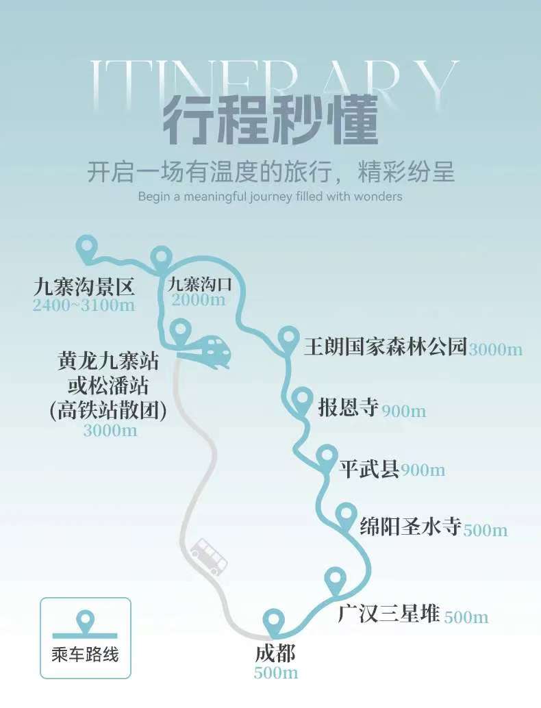 1、交通:全程包车往返,根据人数安排合适车型、黄龙九寨站至成都单程高铁票二等座。行程用车参考: