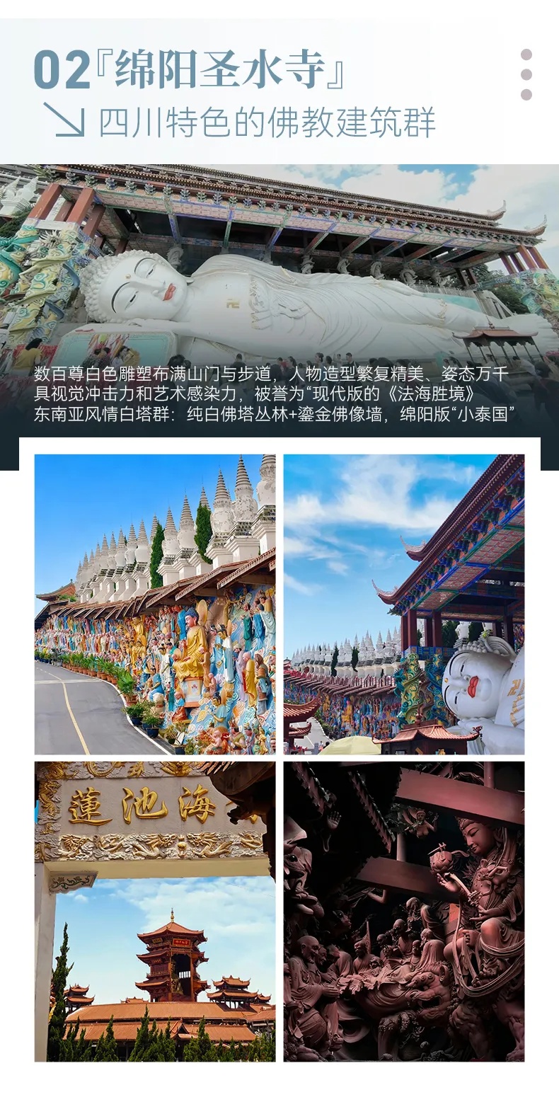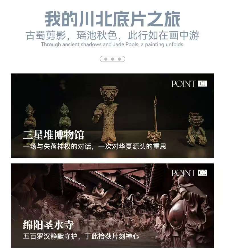 早餐后从成都出发,驱车1.5小时抵达三星堆博物馆,探秘古蜀文明。下午将抵达绵阳圣水寺,圣水寺是一座千年古寺,寺庙入口上山两侧的雕像很是震撼,这里的飞天神女、罗汉雕塑沿台阶铺开,衣袂翩跹得像游戏秘境。拍照极为出片,漫步其中,仿佛在神话世界中与世界对话。罗汉寺有大量罗汉像,巨大的卧佛、白色的佛塔、粉红的睡莲、金色的佛像互相辉映,仿佛置身于东南亚的佛教世界中。游览结束后驱车预估2小时,抵达平武县酒店入住。