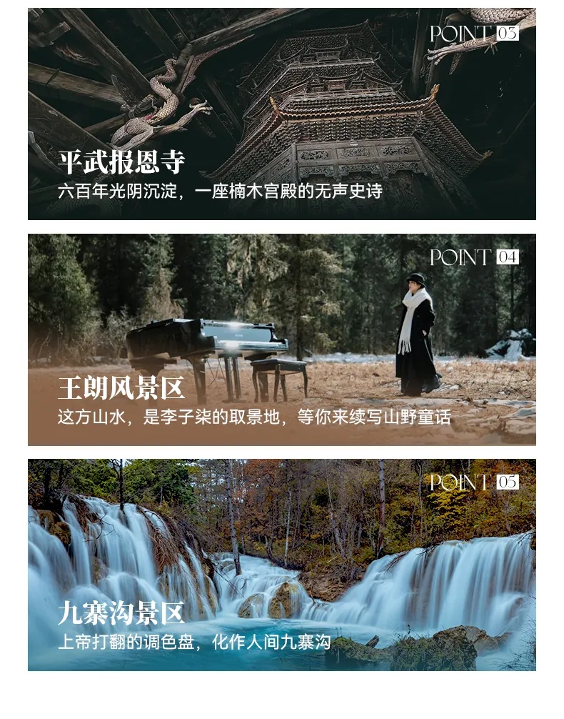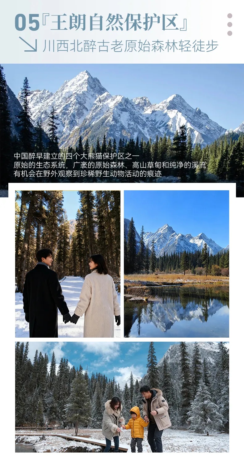 早餐后从平武出发,驱车10分钟抵达报恩寺。报恩寺是四川现存较完整的明代言殿式佛教寺院建筑群。专院由明代龙州宣抚司土官王玺父子奉旨修建,既有皇家寺院的气派,又融合了川西北地域特色,素有"深山故言"之美誉。这座隐匿在岷山深处的古刹,以其独特的建筑艺术和厚重的历史底蕴,向世人展示着明代宗教文化与土司制度的辉煌篇章。下午前往白马王朗国家自然保护区轻徒步。王朗自然保护区作为原始森林与高山生态系统的典范,是“国宝”大熊猫的故乡与野生动物天堂,是白马藏族风情的文化窗口,也是极致宁静的徒步与摄影圣地。结束游览后经九绵高速前往九寨沟沟口入住