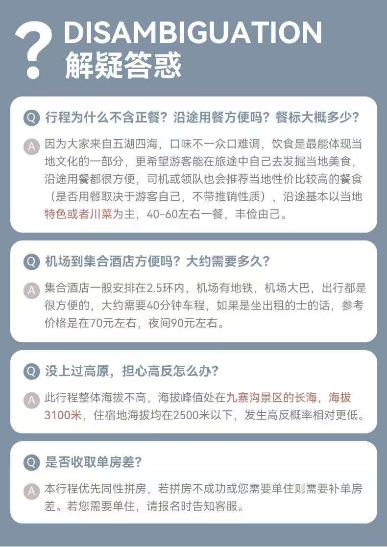 集合日当天请保持手机通畅(一般领队会在集合日下午/傍晚电话联系大家)。如21:00还未接到通知,请及时联系自己的报名客服确认。集合日无行程,请自行安排。